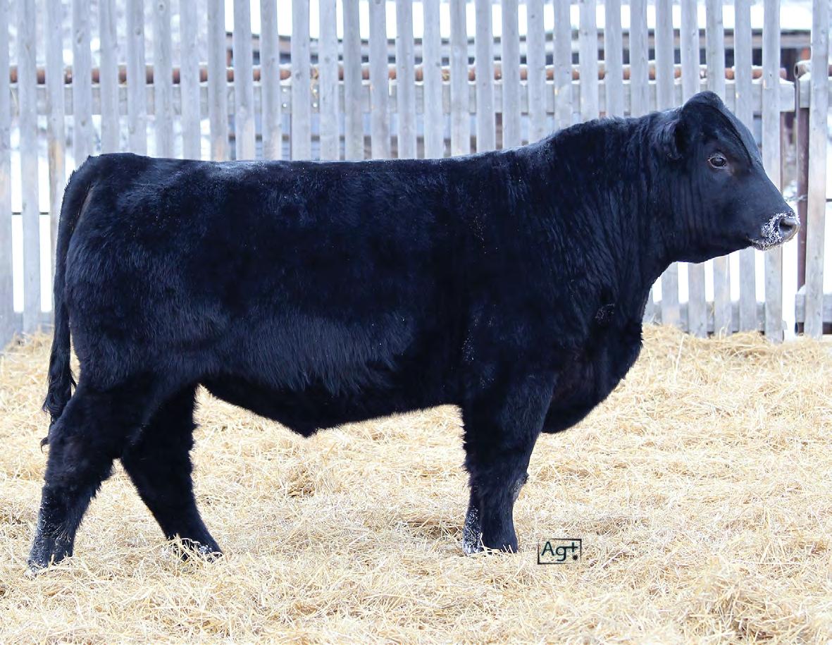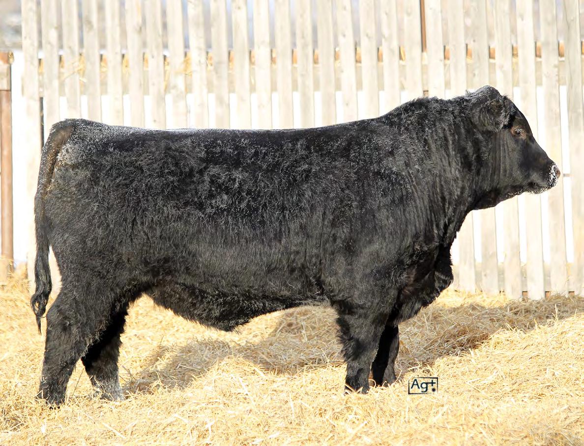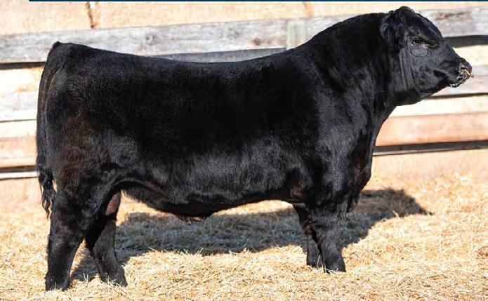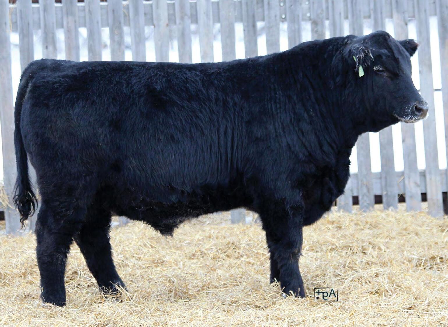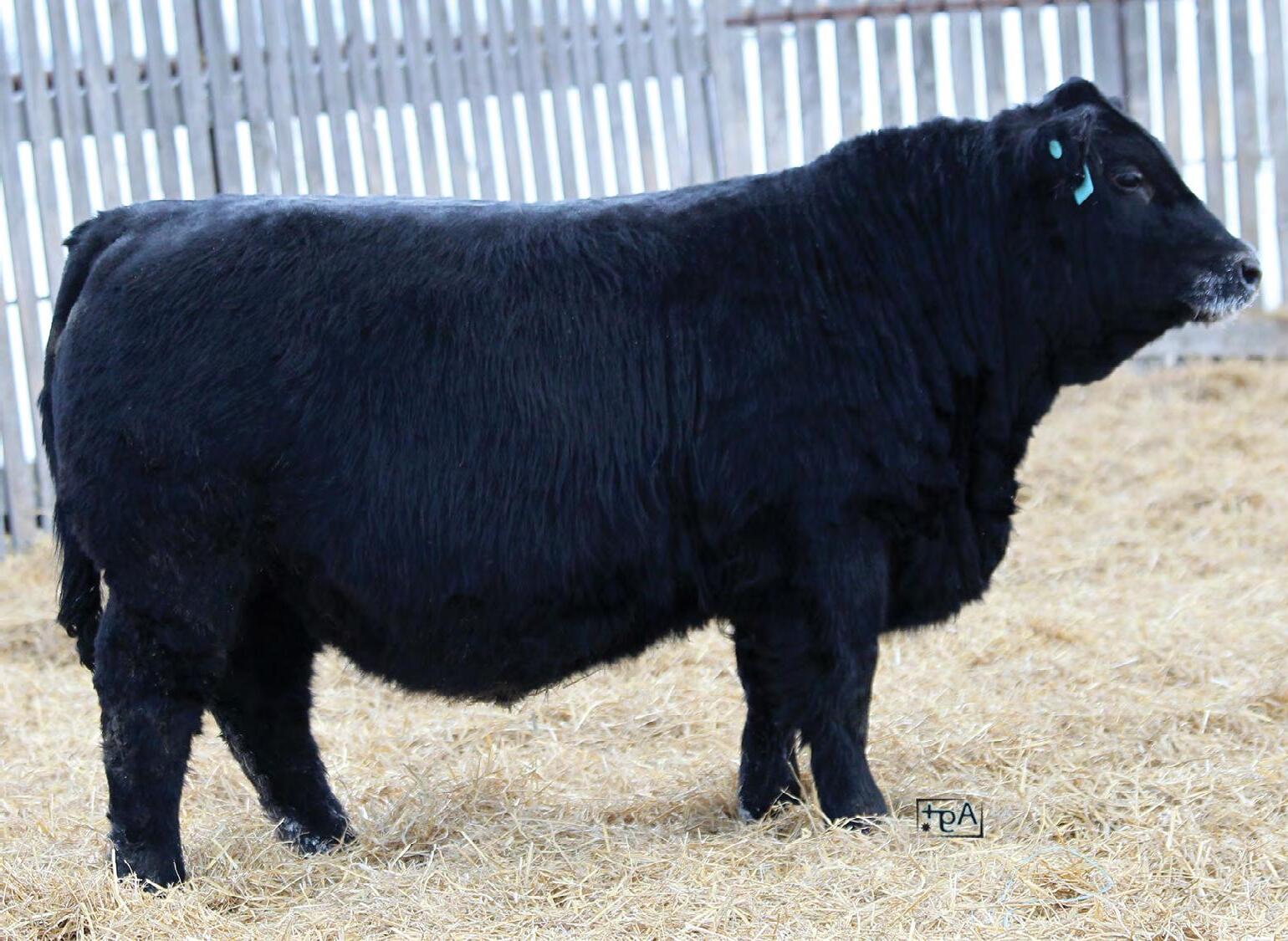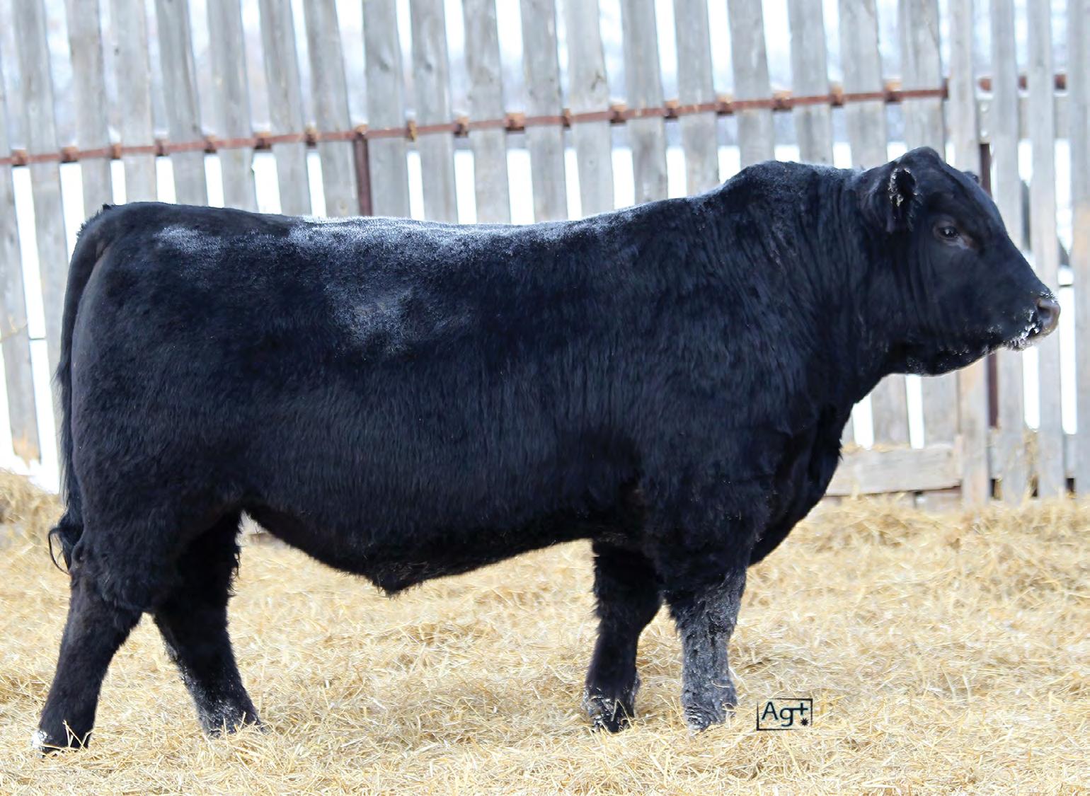 Moderate birth weight, big weaning this solid black bull is long made with lots of hip shape, a big top, and smooth shoulder. His dam is a big cow with lots of volume and a good udder who is a direct daughter of our great donor Smarty Pants.