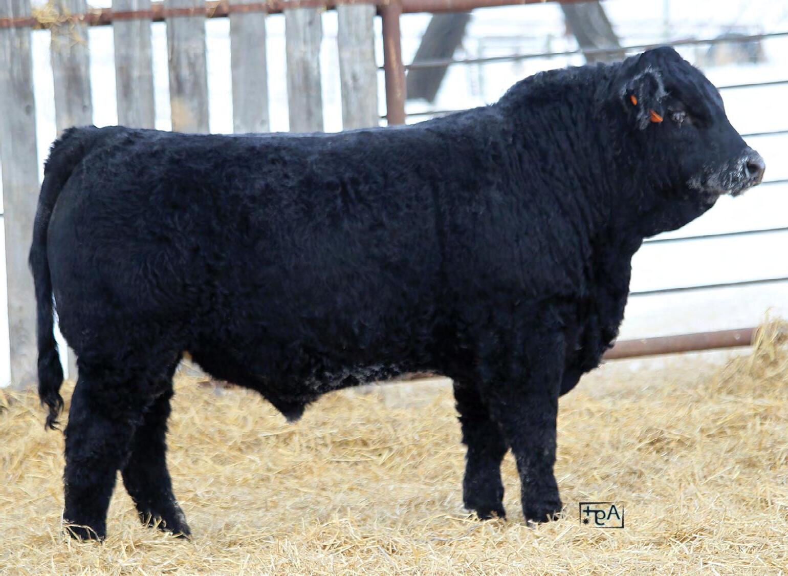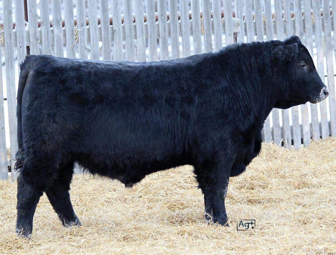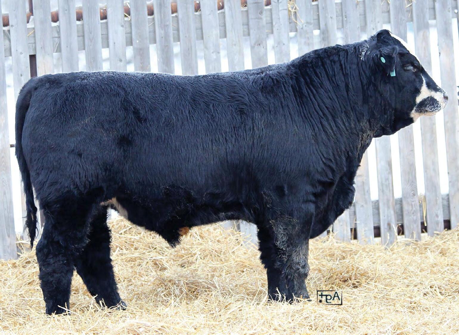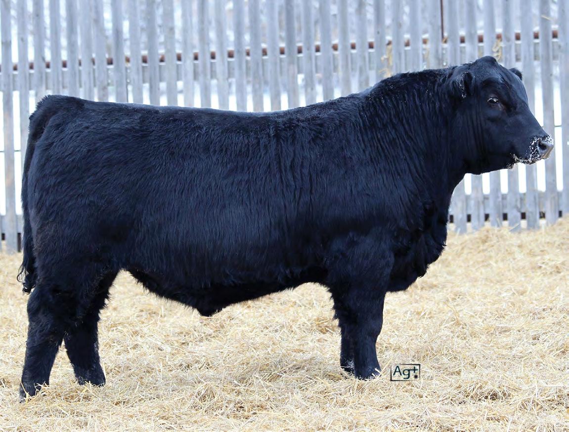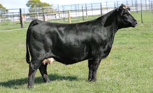 Moderate birth weight, big weaning this solid black bull is long made with lots of hip shape, a big top, and smooth shoulder. His dam is a big cow with lots of volume and a good udder who is a direct daughter of our great donor Smarty Pants.