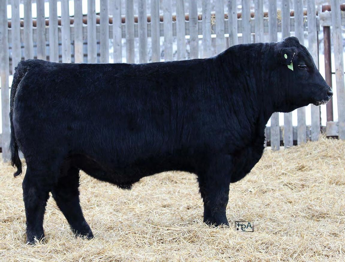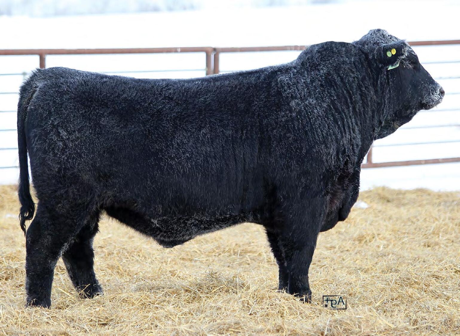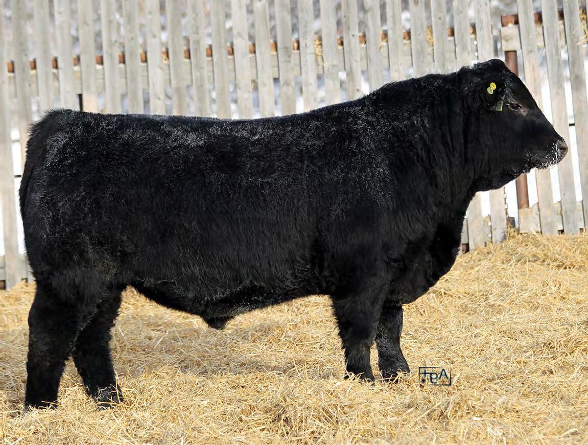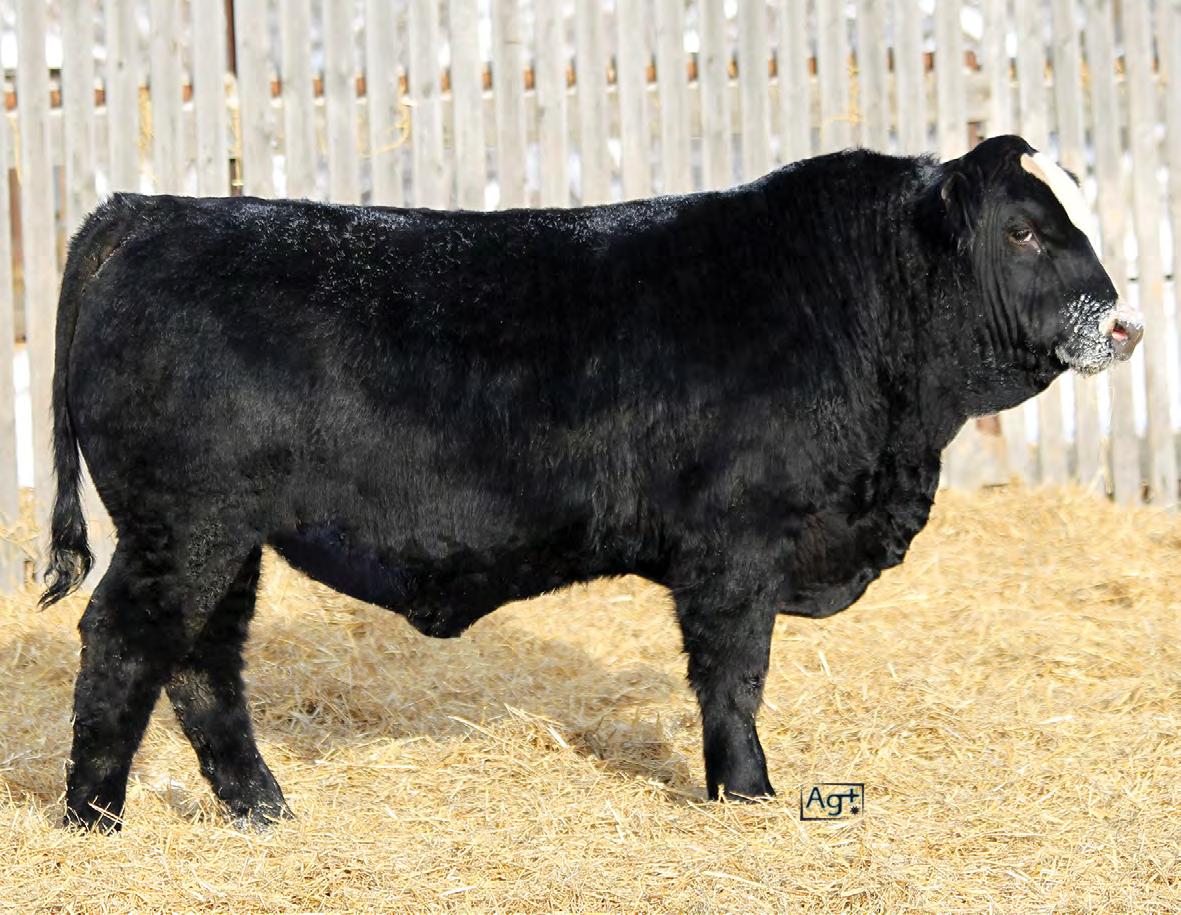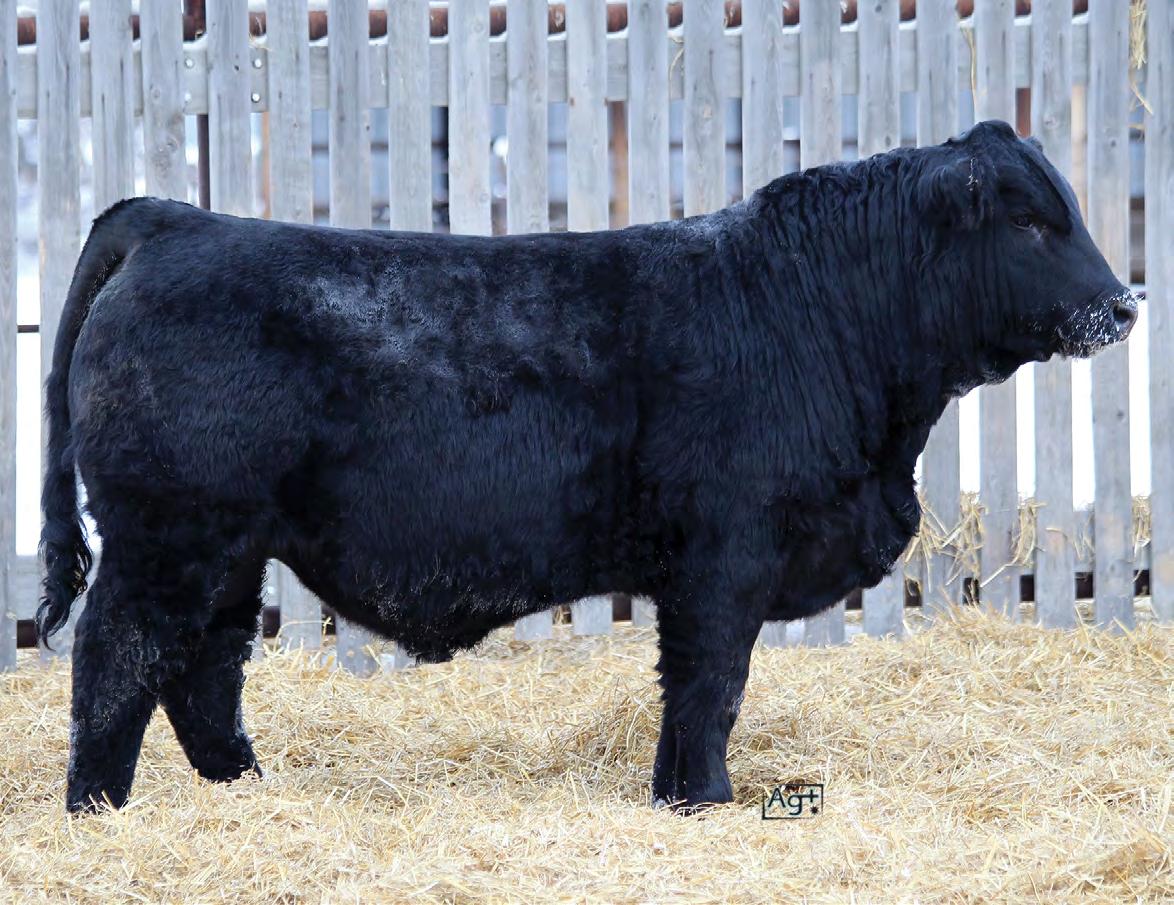 Moderate birth weight, big weaning this solid black bull is long made with lots of hip shape, a big top, and smooth shoulder. His dam is a big cow with lots of volume and a good udder who is a direct daughter of our great donor Smarty Pants.