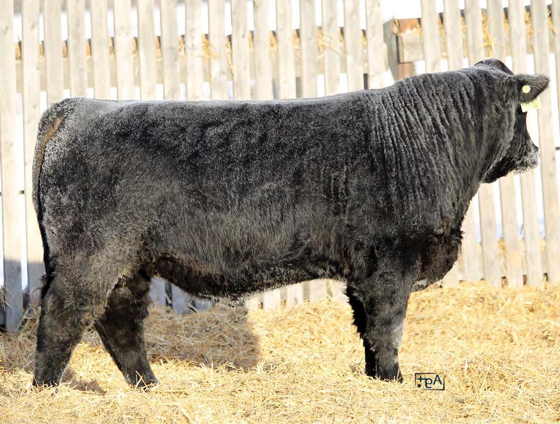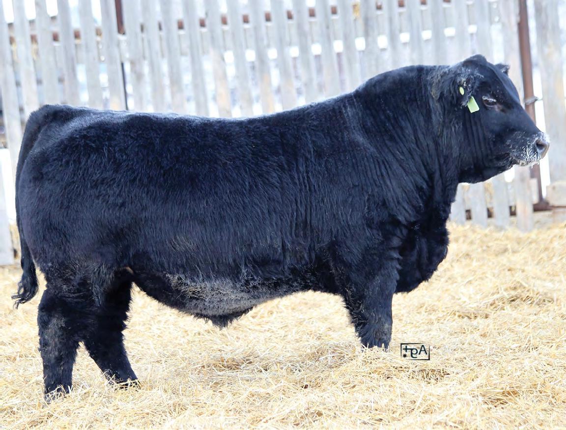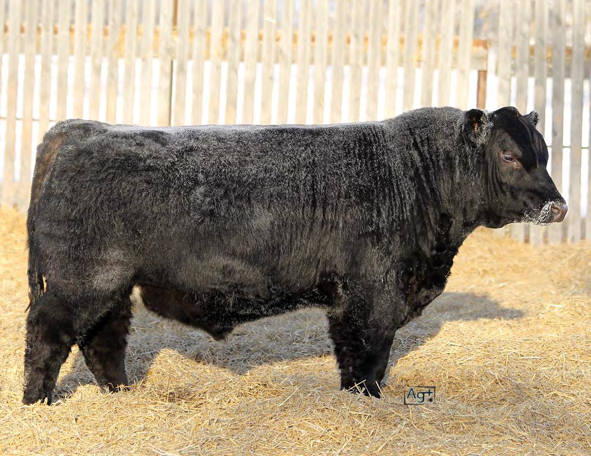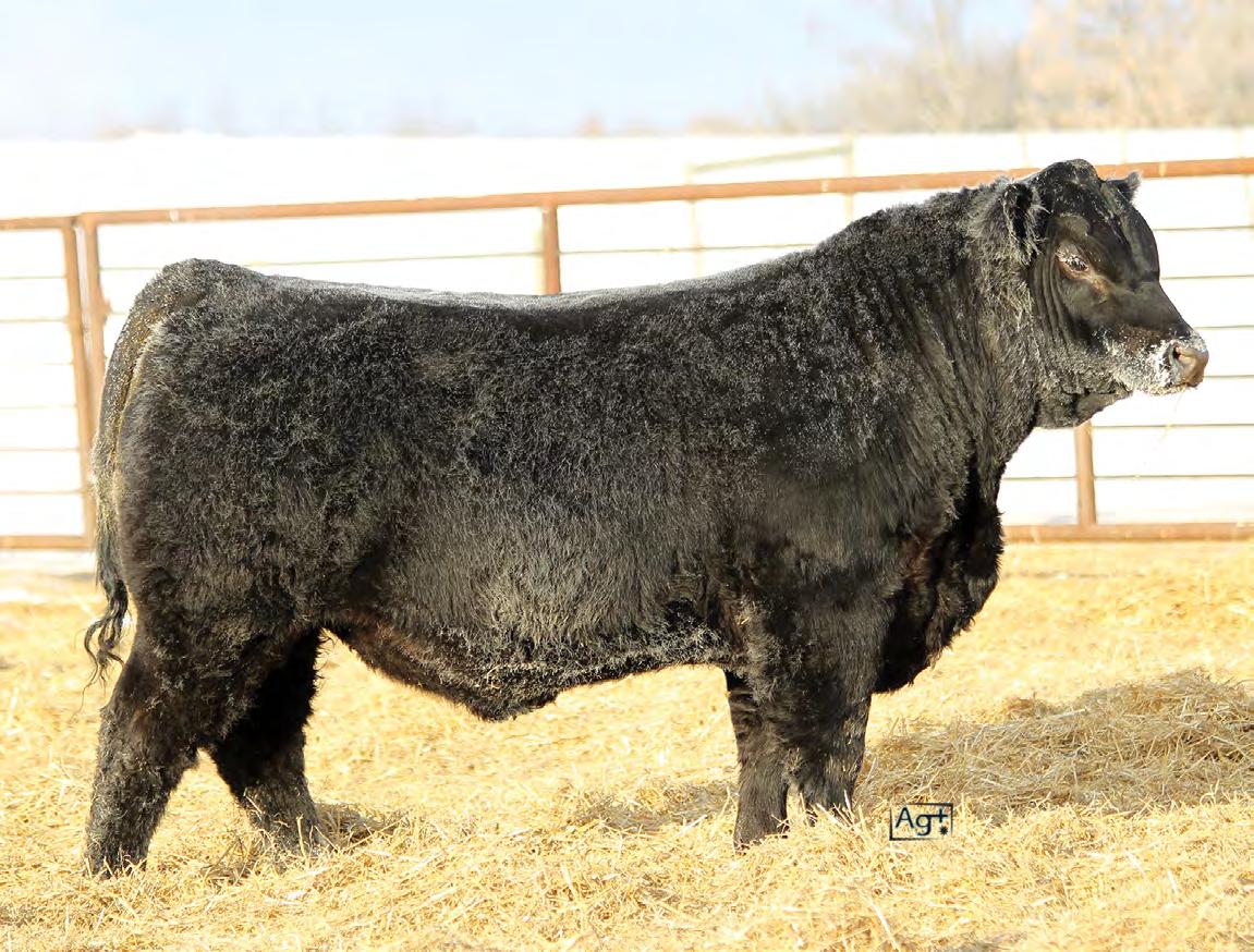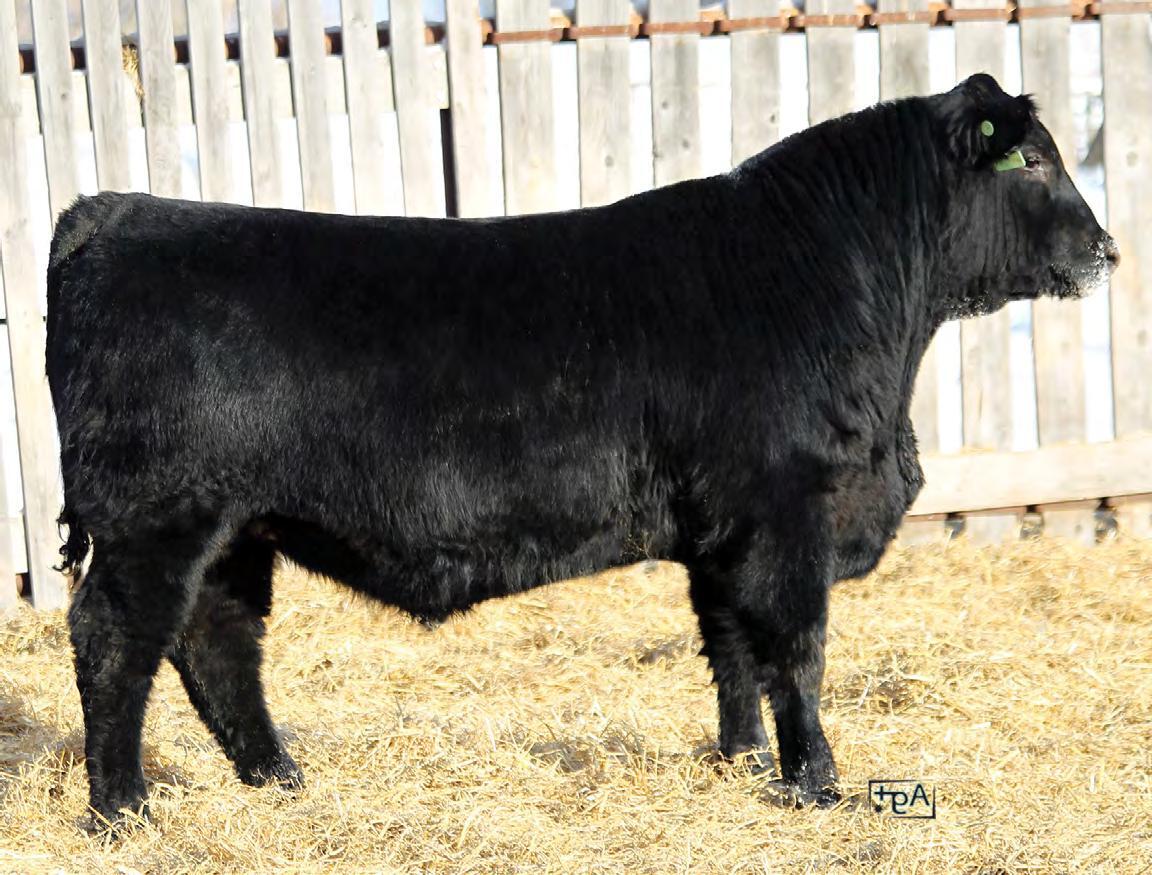 Moderate birth weight, big weaning this solid black bull is long made with lots of hip shape, a big top, and smooth shoulder. His dam is a big cow with lots of volume and a good udder who is a direct daughter of our great donor Smarty Pants.