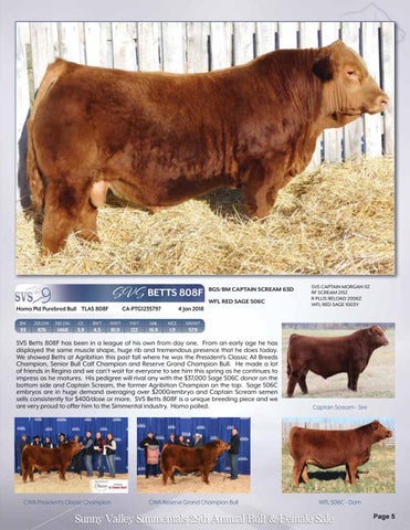 SVS Betts 808F has been in a league of his own from day one. From an early age he has displayed the same muscle shape, huge rib and tremendous presence that he does today. We showed Betts at Agribition this past fall where he was the President’s Classic All Breeds Champion, Senior Bull Calf Champion and Reserve Grand Champion Bull. He made a lot of friends in Regina and we can’t wait for everyone to see him this spring as he continues to impress as he matures. His pedigree will rival any with the $37,000 Sage 506C donor on the bottom side and Captain Scream, the former Agribition Champion on the top. Sage 506C embryos are in huge demand averaging over $2000/embryo and Captain Scream semen sells consistently for $400/dose or more. SVS Betts 808F is a unique breeding piece and we are very proud to offer him to the Simmental industry. Homo polled.