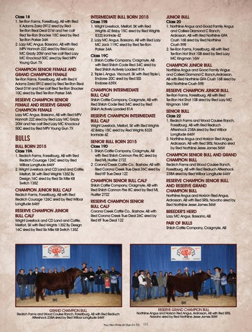 Class 20 1. Northline Angus and Goad Family Angus and Colliers Diamond C Ranch, Ardrossan, AB with Red Northline GFA Crush 16B sired by Red Northline Crush 59R 2. Ter-Ron Farms, Forestburg, AB with Red Ter-Ron Hot Shot 10B sired by Red Lazy MC Kingman 16W