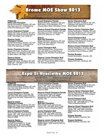 Reserve Senior Champion Bull Daniel Dextradeur, Granby, QC with Dan Dex Maxium ET 121Y GoldenOak 4J Maxium 28M Grand Champion Bull River Road Farm, St FrancoisXavier, QC with RRF All In 710A Triara Unleashed 839U Reserve Grand Champion Bull River Road Farm, St FrancoisXavier, QC with RRF Unlimited 892Z sired by Triara Unleashed 893U Premier Breeder RWB Hereford, Danville, QC Premier Exhibitor RWB Hereford, Danville, QC