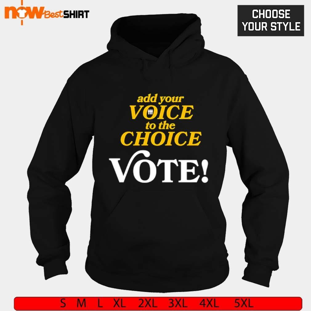 TheAddyourvoicetothechoicevoteshirtismadebyNowbestshirtT-shirtFashionTeam It runsfromXSto5XLsizing It'smadeformen,women,kid,availableonmanystylesasT-shirt, hoodie,sweater,longsleevetee,...onmanydifferentcolors.Youcanbuythisshirtforyourselfor yourlovedonesasagift,it'sperfect!
