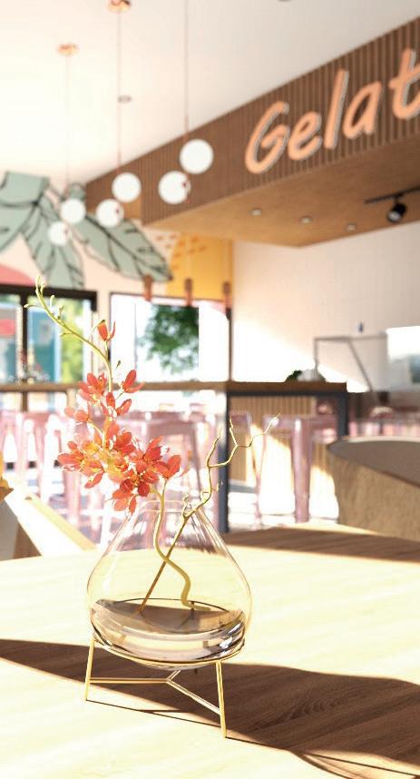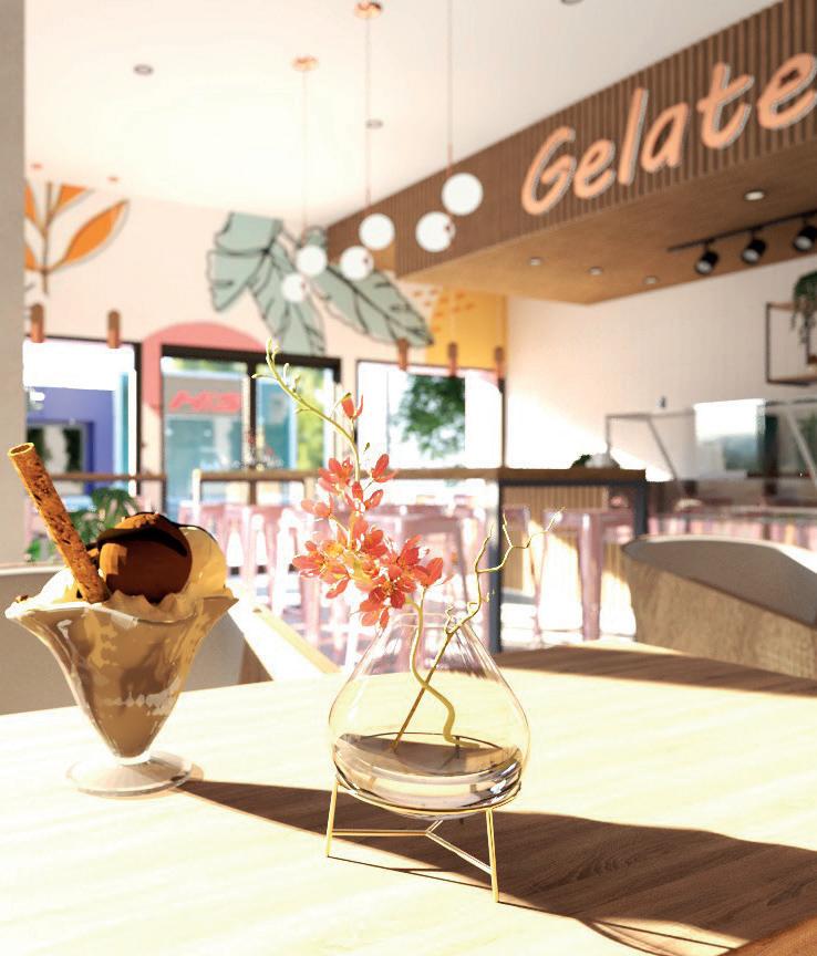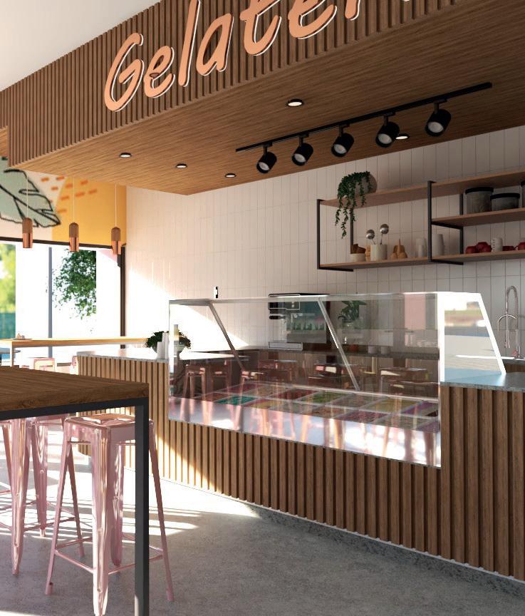 Projeto de estudo realizado por meio da base de estudo disponibilizada pela Pietra, estudante de arquitetura e urbanismo. Localizado em um bairro turístico de uma cidade calorosa, o projeto foi elabarado para um casal que decide abrir uma gelateira. A ideia central deles é permitir um espaço de descanso para os visitates e moradores da cidade, ao mesmo tempo em que podem simplismente pedir um gelato e continuar andado pelas ruas.