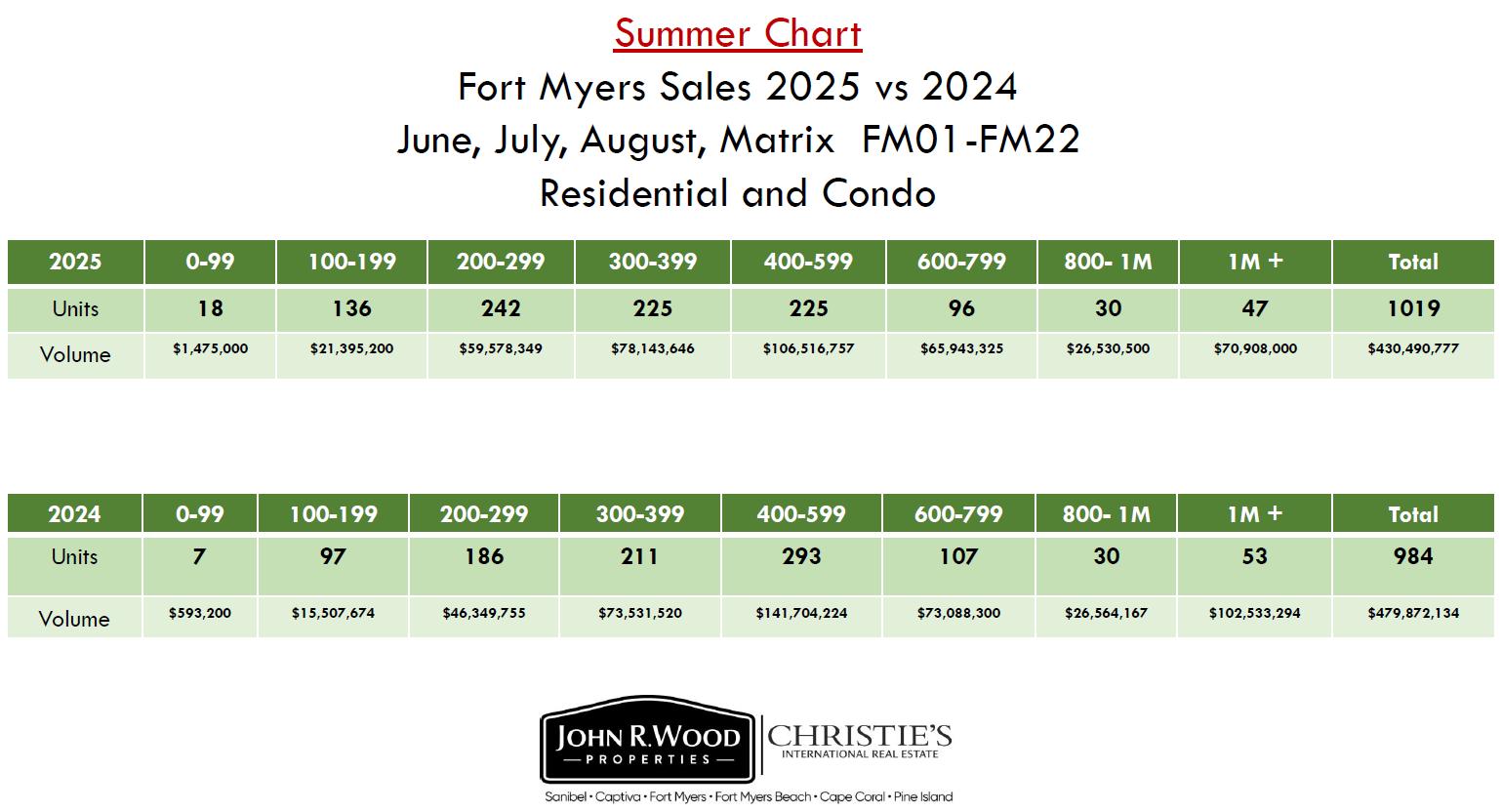 This section provides a focused analysis of residential and condo sales activity across Lee County’s key markets during the summer months (June, July, and August). Each area’s results for 2025 are compared to the same period in 2024, highlighting units sold, total dollar volume, and shifts across different price ranges. Use this chart to quickly see seasonal trends and how summer sales stack up year-over-year