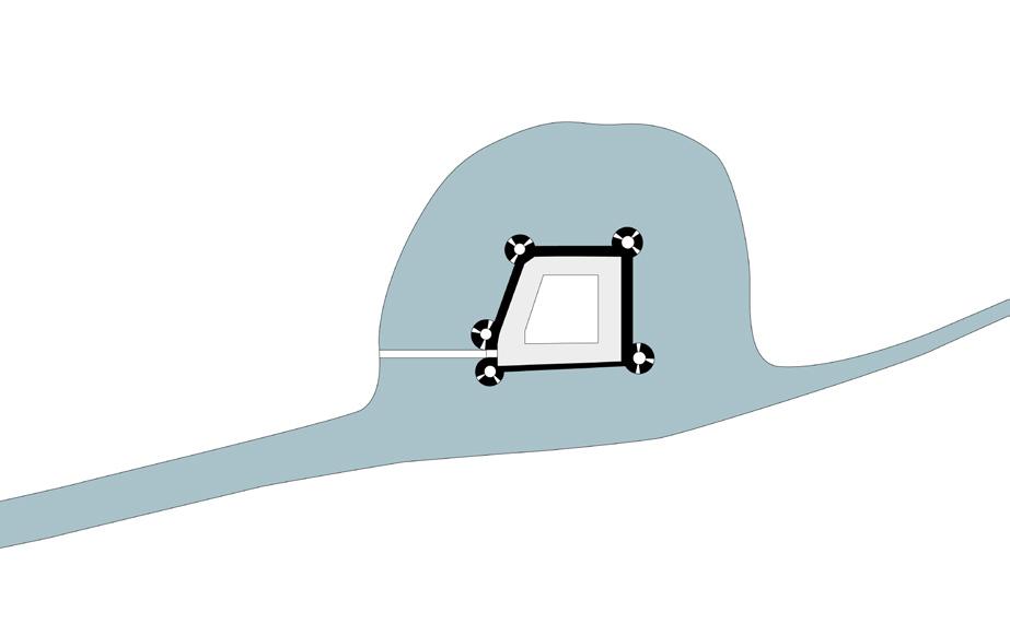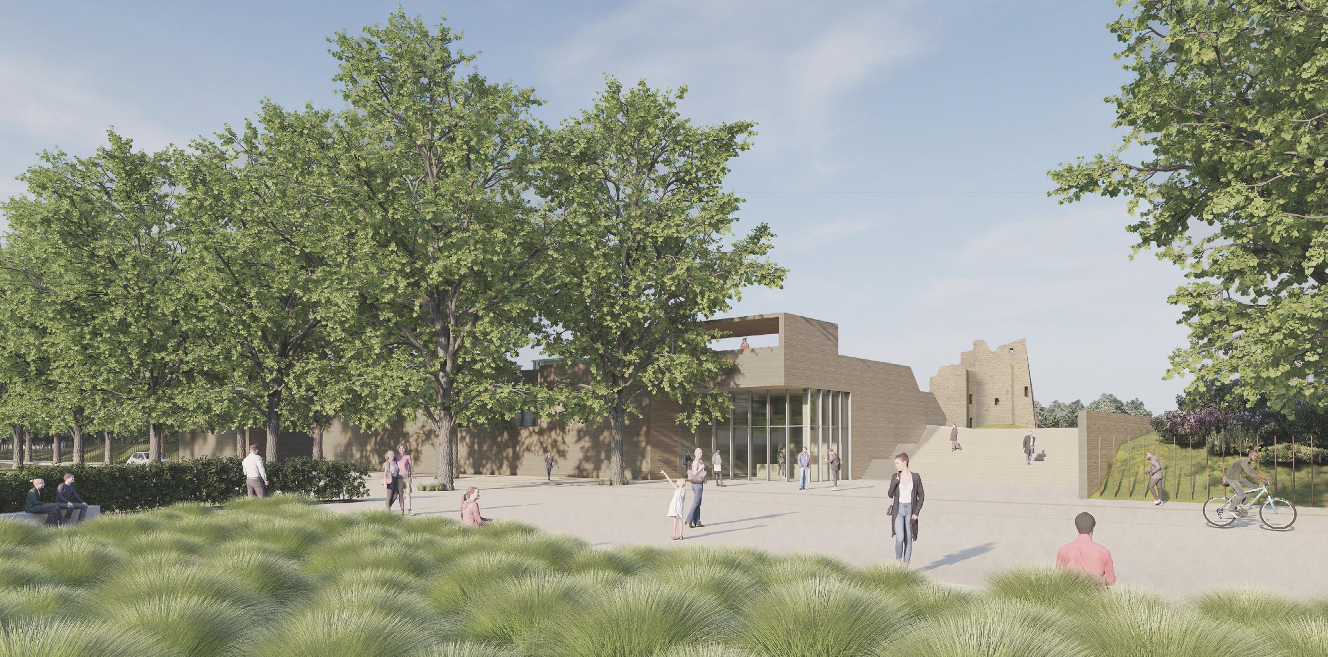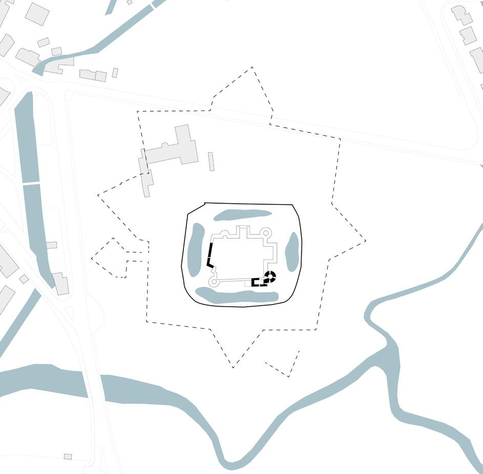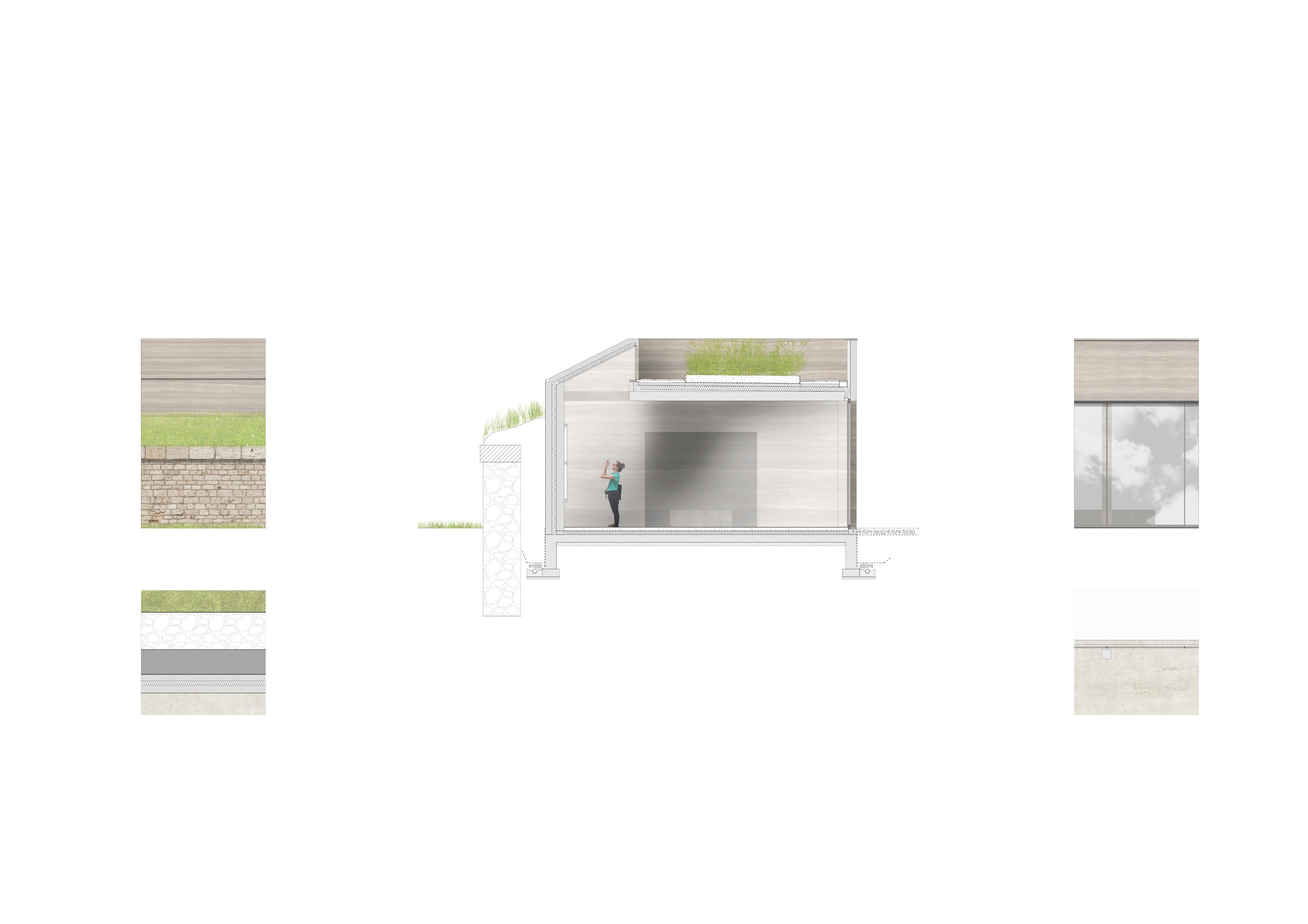 Les murs bastionnés de la forteresse sont excavés et rendus visibles ou bien leur présence est signifiée dans le paysage. Le bâtiment s’installe dans le sol, s’adossant aux anciens tracés