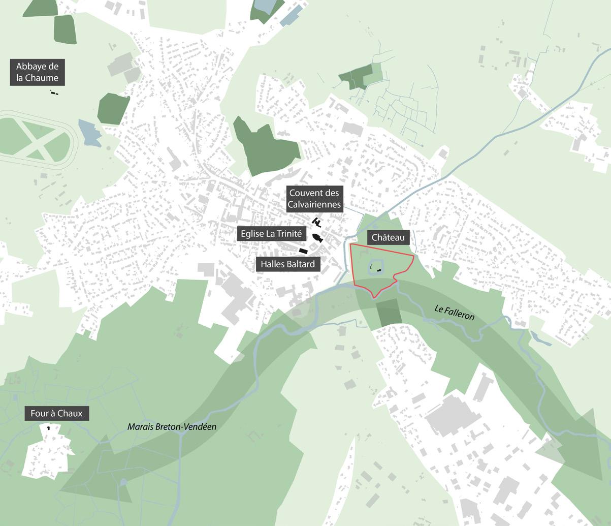 Le site du projet est un terrain de forme triangulaire proche du centre-ville historique de Machecoul. En son centre se situent les ruines du château dont sont encore visibles un mur de logis à l’ouest, une tour-porte au sud-est ainsi que les bases de deux tours d’angle rondes. Le site est bordé au nord par une route monumentale avec un double aligment de platanes et un grand parc public, au sud et à l’est par la rivière du Falleron.
