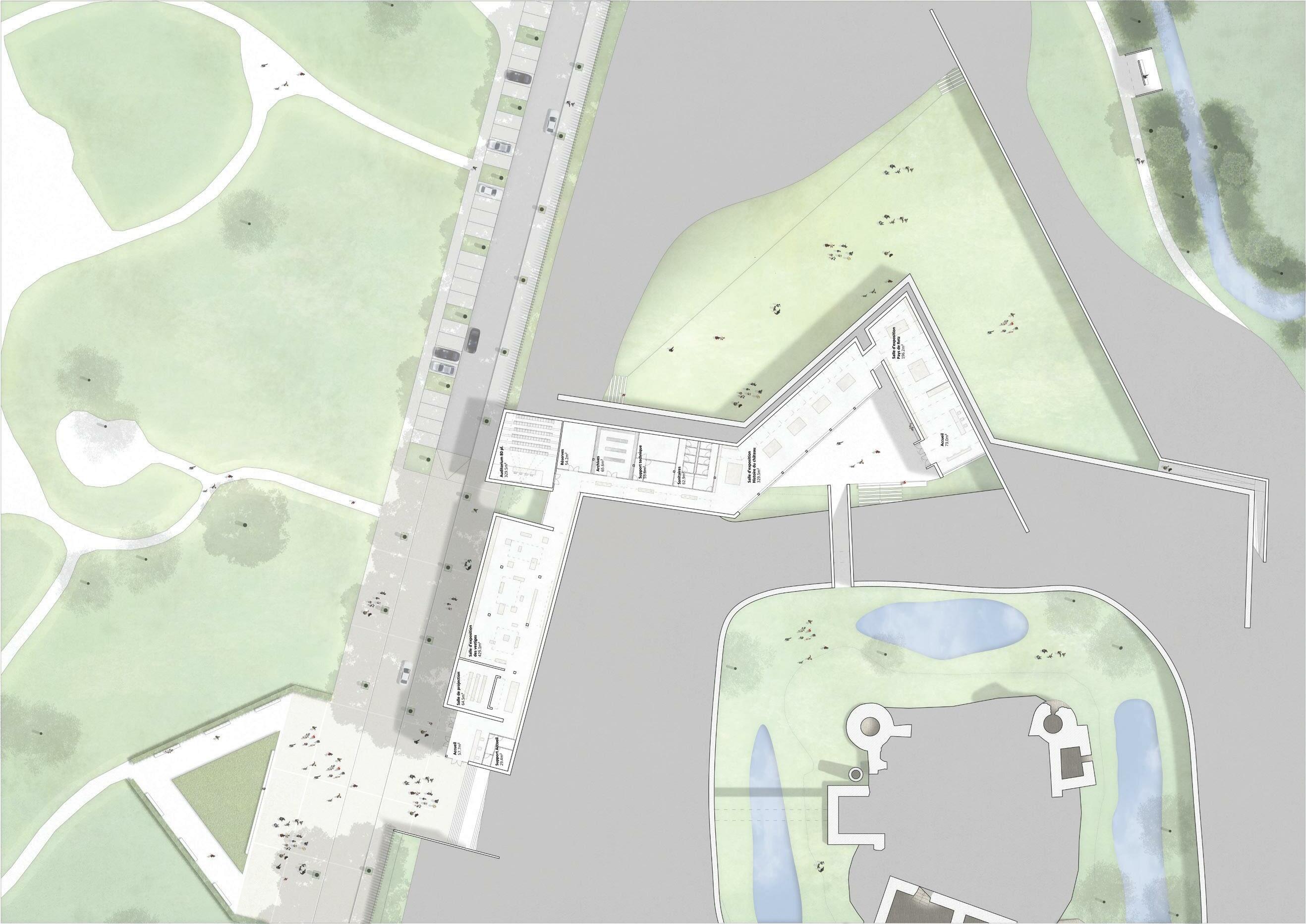 La majeure partie sera travaillé sous la forme d’un parc paysager dans lequel s’implante un musée contenant trois collections : l’exposition des vestiges découverts durant les différentes campagnes de fouilles, la présentation des différents états du château ainsi que la description de son histoire de celle du
