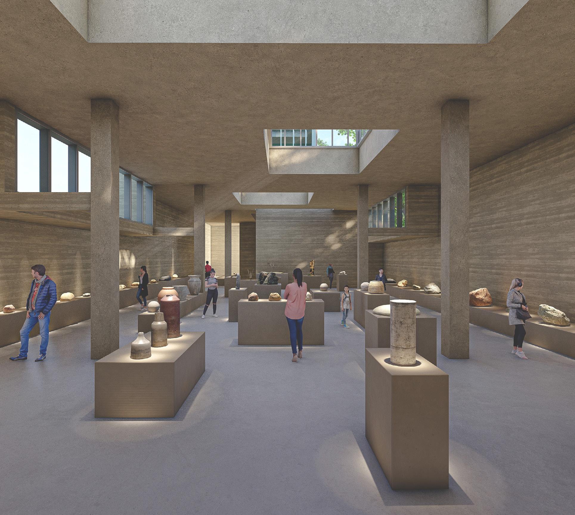 La lumière des espaces d’exposition est captée par le toit des bâtiments et filtrée par des dispositifs architecturaux afin de garantir une lumière homogène dans les salles.