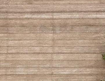 Pour obtenir cette apparence et étant donnée la nature humide de la région et la situation semi-enterrée du projet, le choix s’est porté sur un béton de site «sec» stratifié, mis en œuvre par strates horizontales damées.