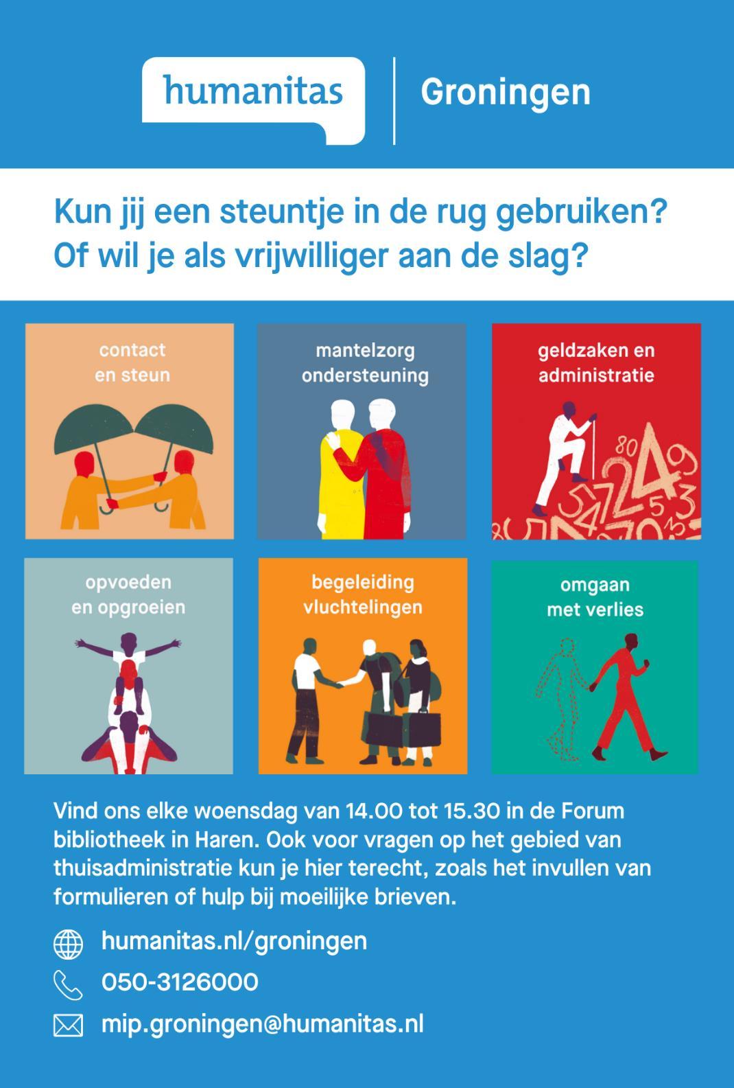 Met vragen over zorg, Wmo en inkomen kunt u terecht bij WIJ Haren, Raadhuisplein 10, 9751 AN Haren, telefoon 050 367 48 84 email wijharen@wij.groningen.nl Humanitas: Voor informatie en aanmelden via telefoon: 050 312 6000 of mip.groningen@humanitas.nl Inloopspreekuur op woensdagmiddag in de bibliotheek van 14:00 15:30.