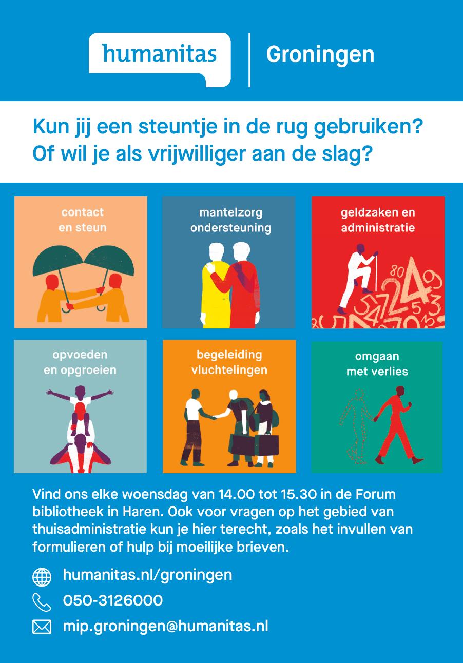 WIJ Haren, telefoon 050 367 48 84 email wijharen@wij.groningen.nl is samen met Humanitas aanwezig op woensdagmiddag in de bibliotheek.