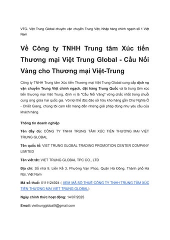 VTG - Việt Trung Global là trung tâm xúc tiến thương mại chuyên vận chuyển chính ngạch và đặt hàng Trung Quốc. Địa chỉ: Số nhà 9, Liền Kề 3, Phường Vạn Phúc, Quận Hà Đông, Hà Nội. Phone: 0966 825 234 Email: vanchuyenviettrungglobal@gmail.com Website: https://viettrungglobal.com/ Hashtag: #vtg #viettrungglobal #nhaphangtrungglobal #vanchuyenviettrungglobal #caunoivang #vietnamtrungquoc #logisticsvietnam