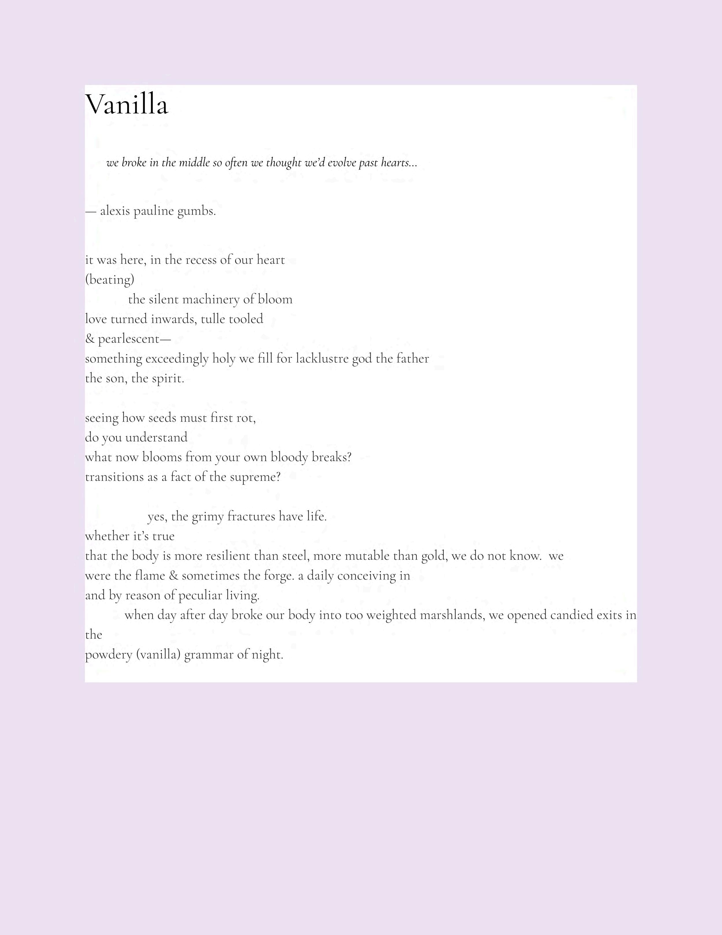we prioritize work from trans women and trans femmes of color. we are BIPOC, disabled, fat, femme, heaux, and poor centered. we seek collaborators of disparate experiences, especially new and emerging trans creators of color. submissions may be previously published and utilize diverse mediums and genres - essays, interviews, memoirs, fiction, poetry, art, media, and more - to explore...