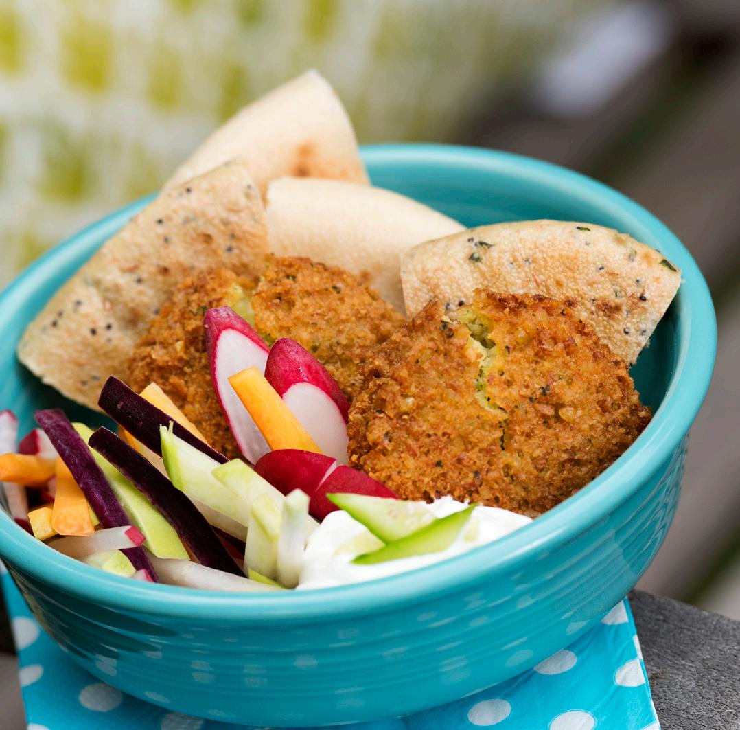 Matchstick all the vegetables, mix together and add to a bowl. Put a dollop of tzatziki in the corner, add the falafel patties and garnish with cilantro and pita wedges.