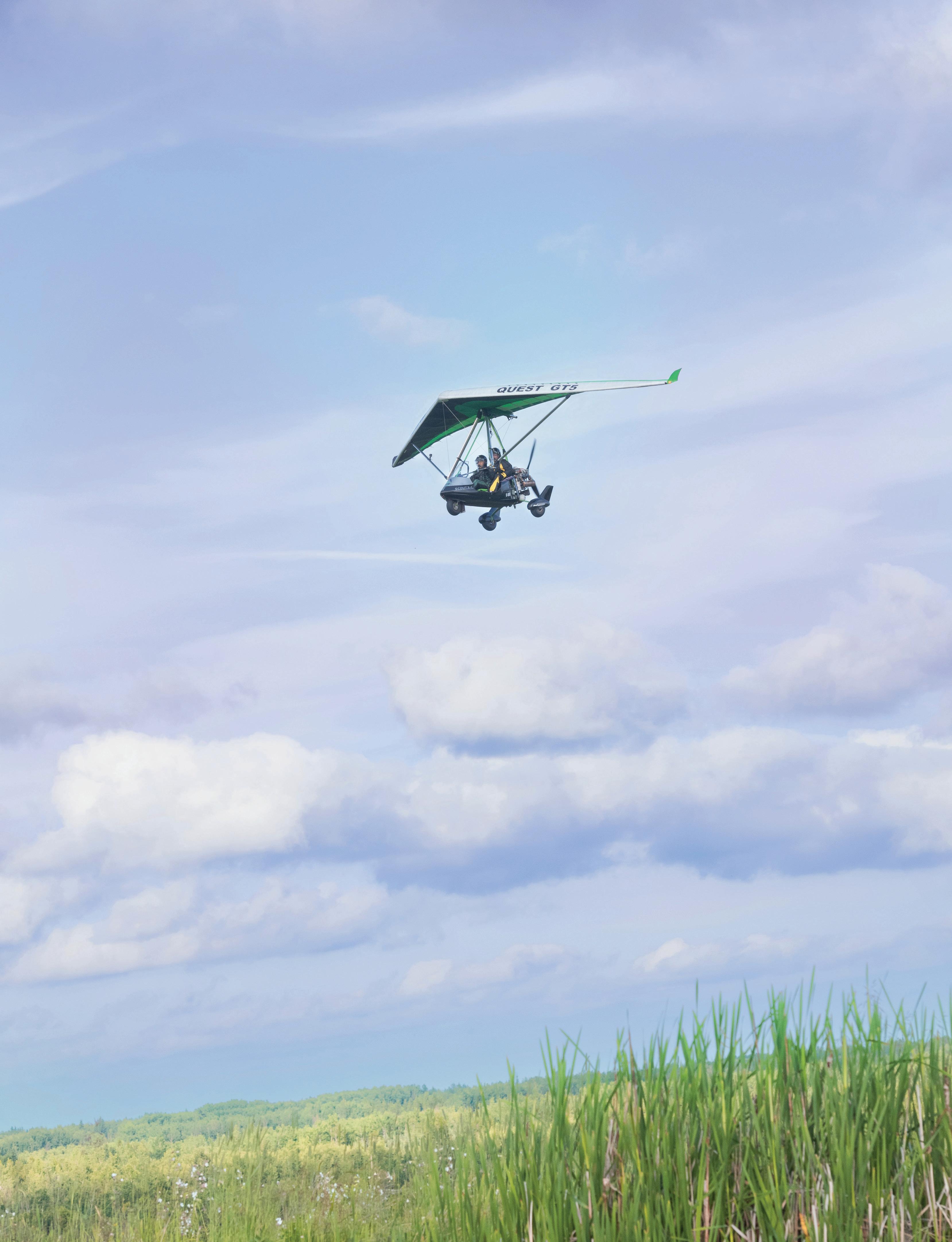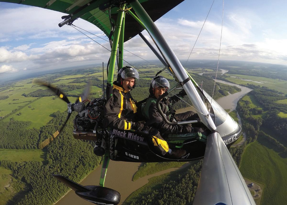 STRAINING TO HEAR the flight instructor over the buzz of the engine, all I can say is that I’ve seen clouds from airplane windows. That’s nothing like feeling it on your skin, Claudio answers, and I get a sense of why he feels so at ease now, a couple of thousand feet above a looping bend in the North Saskatchewan River, northeast of Drayton Valley. The Air Adventure Flight School’s ultralight trike that he’s piloting and in which I’m a passenger has an open-air cockpit, so the views are all around us. The twisting, greenishbrown river. The fields, brightly verdant with July rain, stretching into the hazy distance. A tractor-trailer crawling along a secondary highway below. Endless sky. From this height, everything looks not so much distant as somehow miniaturized.