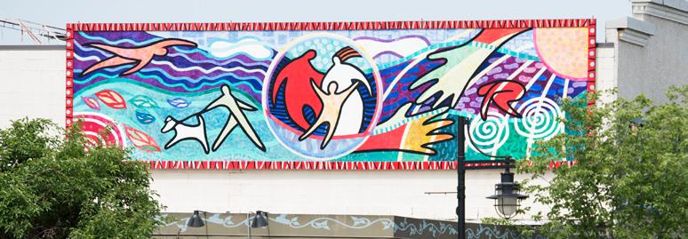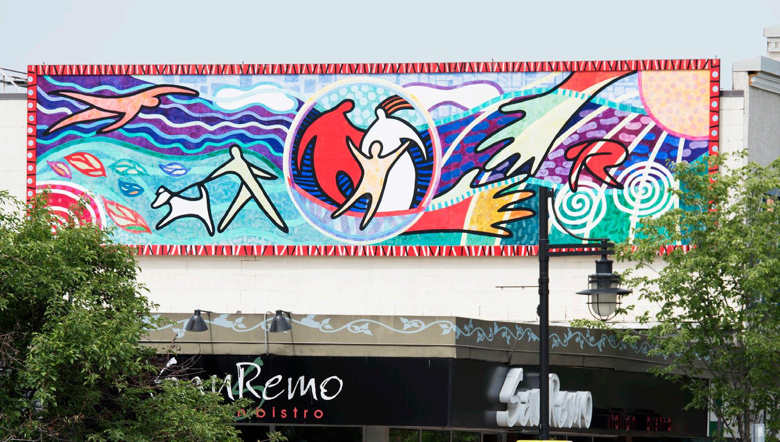 Since outdoor public art has to withstand the Alberta elements year round, the City is developing new techniques for sustaining and extending the life of our outdoor murals. They include using changeable framing systems, water diversion and updated printing techniques.