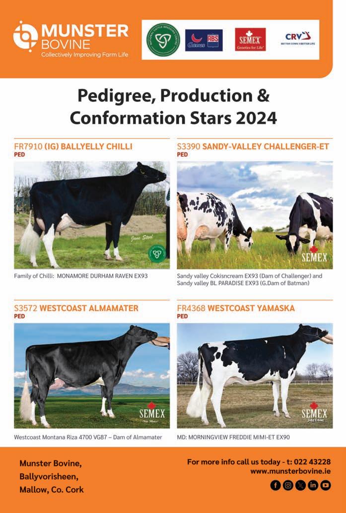 Lot 55 Kilgarriffe Pietje 130, selling in aid of West Cork Rapid Response and Palliative Care Services, is from a potential 9th generation VG or EX member of the Pietje family. The Pietje’s are known for their strength, functional type, and consistent production. Pietje 130’s grand dam sold for €4,650 in the Kilgarriffe Sale 2022. Her dam, Kilgarriffe Pietje 101 sired by Koepon Raptor, also sells as LOT 13. The calf is sired by HW Bossink Diego, a bull from the exceptional Dutch Miranda family. Diego’s extended pedigree is Aikman x Talentino EX91 x Incas EX92 x Stadel EX91 x Tulip VG87 x Bram EX90. Not only exhibiting functional type and balance, the Miranda family can also produce high component milk. Five generations of this family have produced over 5% fat and 3.9% protein! Two of these cows also produced over 100 tonnes of milk.
