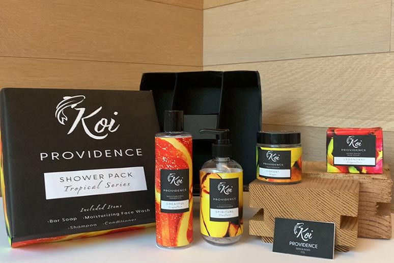 The objective was to conceptualize and construct packaging for shampoo, conditioner, soap, and skin lotion as part of a set in a product line for a hypothetical self care brand called Koi, Providence. Individual bottles/ boxes would be designed and embroidered, and would all be combined into a variety package designed to hold the product line as a whole.