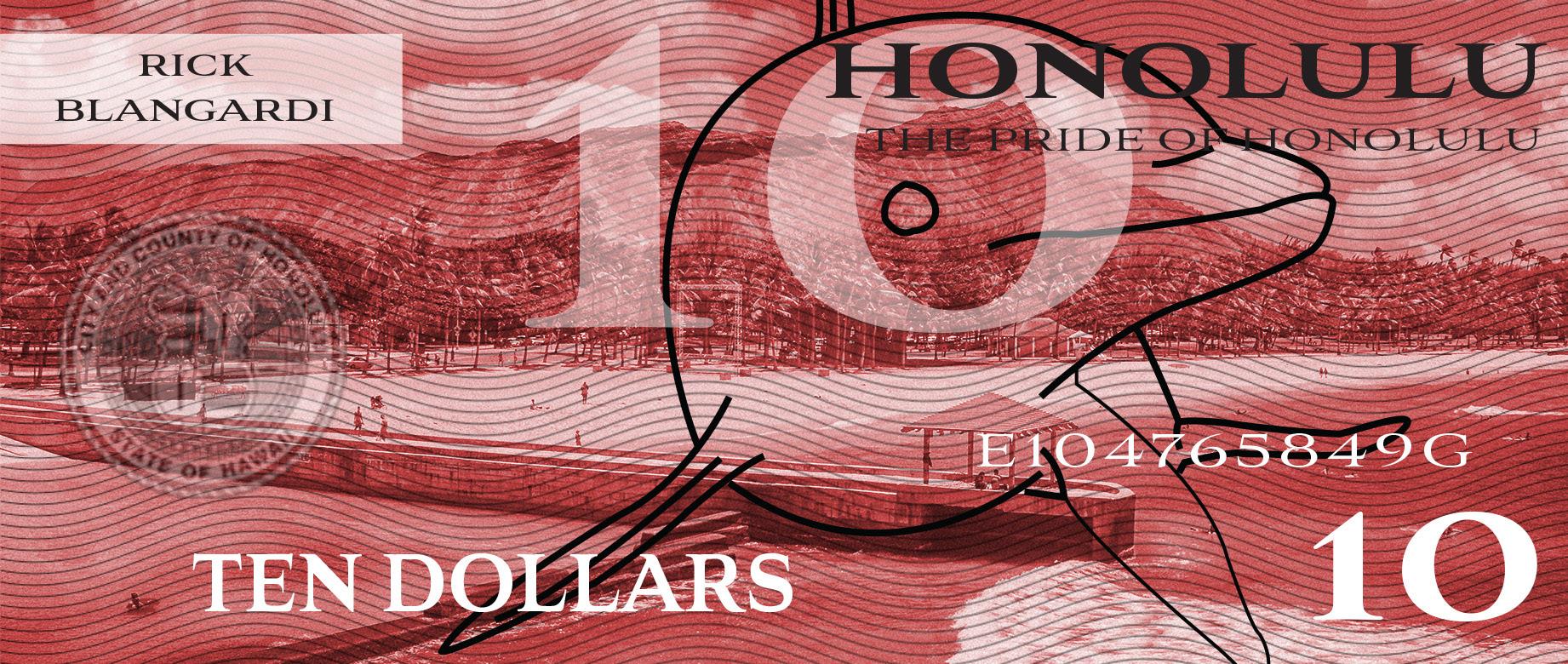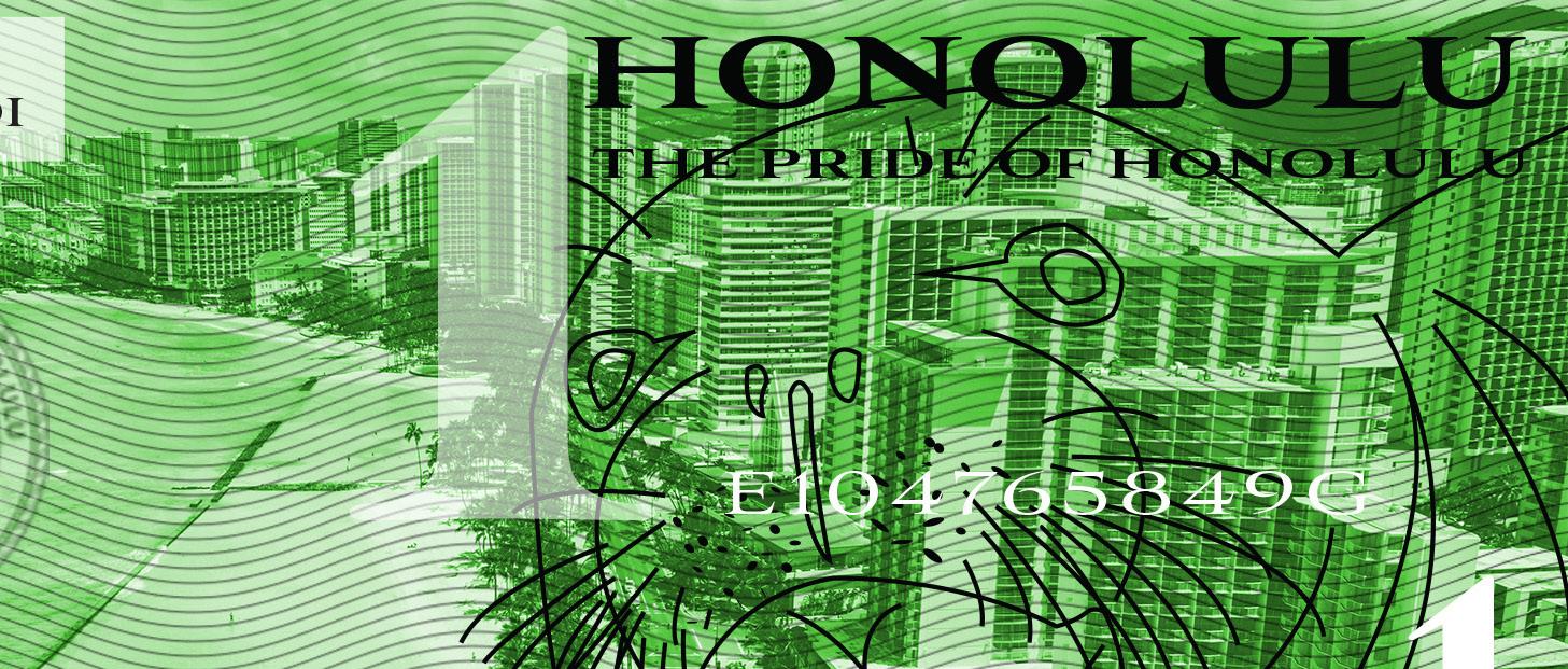 This project flexed my ability to combine simple illustrations with aspects of the culture I grew up in. I took a lot of inspiration from the scenery of Honolulu, as well as a diverse range of different types of foreign currency. With a paradise/tropical island concept forming in front of me I made the decision to create outlined graphics for four animals found on or around the Hawaiian islands. These graphics would be the centerpiece of each bill, and the background would be filled by pictures of famous landmarks located in Honolulu.