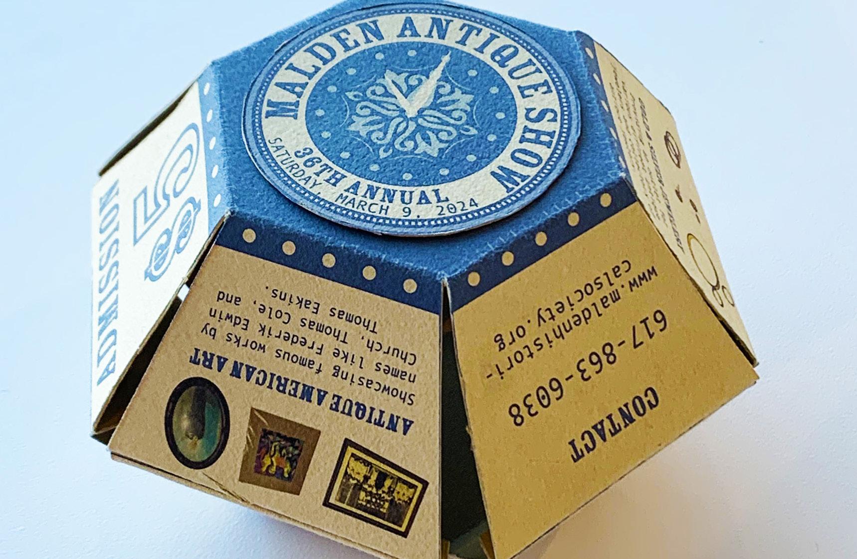 The objective was to creatively design a promotional brochure around the Malden Historical Society’s annual antique show event. The only specification for the project was that it couldn’t be a normal brochure, so I made a polygon instead.