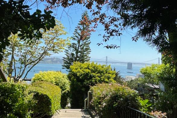 After giving this some thought, I decided to take them on my favorite walk past semi-hidden, private gardens, which I knew Lorna would enjoy. We started at Coit Tower near my apartment, then found the path to the Greenwich steps, one of many San Francisco staircase paths that can be hard to find but worth the effort.