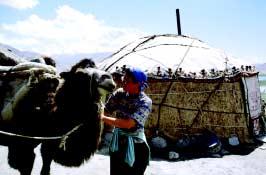 Ko kon~no stopi{ na Kitajsko, se krajina iz ozke in zaprte kar naenkrat raz{iri v prostrane travnike, preko katerih te~e, za razliko od motnih ledeni{kih, bistra gorska reka. Na travnikih so ~rede jakov, koz in ovac ter majhne skupine oslov, konj in kamel. Sem ter tja se iz zelenja belo zasveti jurta, {otoru podobno nomadsko prebivali{~e. V eni izmed njih sva pri jezeru Karakul tudi prespala, gospodar pa naju je popoldan s kamelami in konjem peljal na obisk k sorodnikom v 2 uri oddaljeno vasico. Na za~etku romanti~na avantura se je sprevrgla v mukotrpno je`o, saj nazaj grede zadnje plati sploh nisva ve~ ~utila.