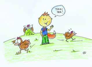 Otroci z zatisnjenimi o~mi ~epijo v krogu, tako da se s ~elom dotikajo kolen. Tako ponazarjajo spe~e koko{i.