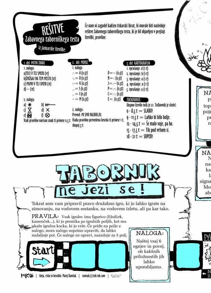 Uredni{tvo: Ale{ Cipot (ales.cipot@rutka.net) - glavni in odgovorni urednik, Miha Bejek (miha.bejek@rutka.net) - pomo~nik urednika in lektor, Bla` Verbi~ (blaz.verbic@rutka.net) - urednik fotografije, Meti Buh (meti@rutka.net) in Ale{a Mrak (alesa.mrak@siol.net) - urednici sklopa Igra, Toma` Sinigajda (sini@rutka.net) - urednik sklopa Dogodiv{~ina. Predsednik izdajateljskega sveta: Igor Bizjak (bizi@rutka.net). Novinarji in sodelavci: Nina Arnu{ (arnusnina@gmail.com), Barbara Ba~nik (barbara.bacnik@rutka.net), Jaka Bevk (jaka.bevk@cmok.si), Sergeja Bogovi~ (sergy@rutka.net), Borut Cerkveni~ (borut.cerkvenic@guest.arnes.si), Tanja Cirkven~i~ (tanja@rutka.net), Klemen ^ade` (stfk@kss-loka.si), Irena Jeretina (irena@rutka.net), Klemen Kenda (bubi@rutka.net), Primo` Kolman (primoz.kolman@yahoo.com), Da{a Lamut (dasica@gmail.com), Miha Ma~ek (muc@rutka.net), Frane Merela (frane.merela@guest.arnes.si), Boris Mrak (boris.mrak@epn.ba), Tadej Pugelj (pugy@rutka.net), Matej Ram{ak (ramsak@tok-tok.com), Lea Repi~ (lea.repic@siol.net), Nasta Roblek (kricakraca@yahoo.com), Ale{ Skali~ (amerikanec@rutka.net), Matic Stergar (matic.stergar@kss-loka.si), Maja Strnad (m.strn4d@gmail.com). Ustanovitelj, izdajatelj in lastnik Zveza tabornikov Slovenije, Ljubljana, Parmova 33. TABOR sofinancira Ministrstvo za {olstvo, znanost in {port Republike Slovenije. NASLOV UREDNI[TVA: Revija Tabor, Parmova 33, 1000 Ljubljana. Telefon 01/30008-20, fax 01/4361-477, e-po{ta: tabor@rutka.net, info@zts.org. WWW: http://www.zts.org. Cena posameznega izvoda je 500 SIT, letna naro~nina je 5000 SIT, za tujino pa letna naro~nina s pripadajo~o po{tnino. Transakcijski ra~un: 02010-0014142372. Rokopisov in fotografij ne vra~amo. Upo{tevamo samo pisne odpovedi do 31. januarja za teko~e leto. Revija izhaja vsak drugi petek v mesecu. DDV je vra~unan v ceno. Grafi~na priprava in tisk: Tridesign d.o.o., Ljubljana. [tevilka je bila tiskana v nakladi 6400 izvodov. Po{tnina pla~ana pri po{ti 1102 Ljubljana. Revija Tabor je vpisana v razvid medijev, ki ga vodi Ministrstvo za kulturo RS, pod zaporedno {tevilko 792.