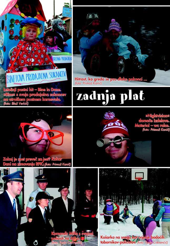 ^lani Rodu zelena Rogla iz Zre~ smo med 24. februarjem in 1. marcem organizirali `e 20. tradicionalno vsakoletno zimovanje v taborni{kem domu na Skomarjah. Pridru`ili smo se tabornikom iz Kobanskega rodu iz Selnice ob Dravi, ki so prispeli `e v sredo. [tirideset mladih tabornikov je pod vodstvom svojih vodnikov spoznavalo no~no nebo in nebesna telesa, osnove orientacije, lov na lisico s pomo~jo oddajnikov, `ivljenje v naravi, zimske `ivali in izdelovalo sne`ake. Sobotni ve~er je minil v izbiranju »kralja in kraljice taborni{ke pustne {eme«, ob pustnem plesu in zabavnih igrah. Dru`enje se je zaklju~ilo v sredo, ko smo se vsi skupaj popoldne odpravili domov z `eljo, da se drugo leto spet udele`imo zimovanja.