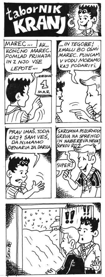 V reviji najraje berem tabornika Kranjca. Prav zaradi tega bi bil zelo vesel, ~e bi ga rahlo raz{irili ali pa uvedli {e kak{en nov strip. V{e~ mi je kri`anka in rubrike Tabor na obisku, Faca, Intervju.
