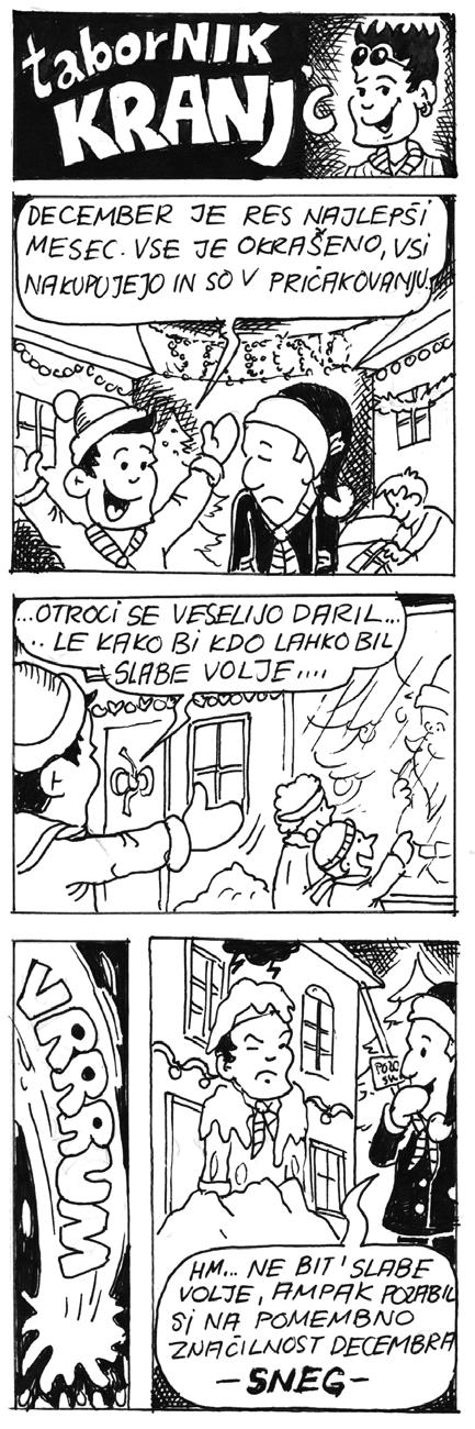 taborniškega življenja ter srečnih družinskih trenutkov. Revija Tabor je postala v poslavljajočem se letu bogatejša za kup novih pridnih in mladih sodelavcev, ki so obogatili vsebino, ki jo vsak mesec prejemate v svoje nabiralnike oziroma poiščete na spletnih straneh. Vsekakor ne pozabimo tudi na starejše, dolgoletne tabornike, ki so pripravljeni v vsakem trenutku priskočiti na pomoč. Vsem naštetim, pa tudi ostalim neimenovanim sodelavcem in vam, spoštovane bralke in bralci, se uredništvo zahvaljuje za vse lepo, kar smo v tem letu skupaj doživeli. Tudi kakšna grenka izkušnja se je prikradla, vendar kot pravi taborniki vemo, da je to le šola za življenje. Do 16. januarja, ko se zopet srečamo, vse naj v letu 2009!
