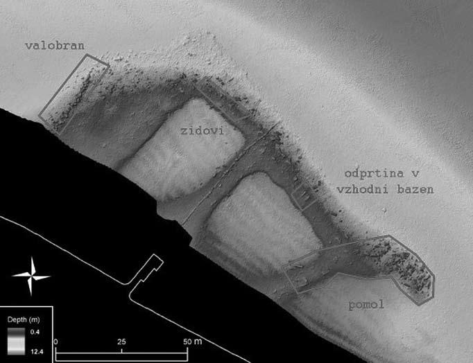 3-dimenzionalni model področja rimskega pomola v Zalivu Sv. Jerneja na severnem delu Debelega rtiča.