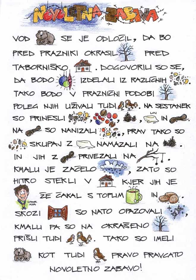Na dnu škatle se je skrivala tudi čestitka. Uga ni, kaj je na slikah, nato pa vsa ko črko, ki je označena s šte vilko, prepiši na pravo mesto v ges lu in preberi, kaj je pisalo v čestitki.
