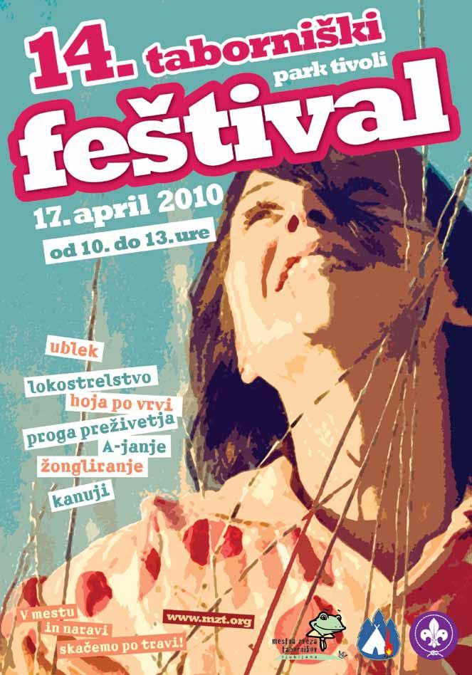A 17. aprila 2010 bomo počeli še marsikaj drugega. Ljubljanski taborniki bomo v počastitev dneva tabornikov in dneva Zemlje pripravili že 14. Taborniški feštival. Ker je to naša tradicionalna prireditev, je zaradi čistilne akcije nismo morali kar tako ukiniti. Vemo, da vas bo letos zato nekoliko manj, a kljub temu v priprave ne vlagamo nič manj energije in dobre volje. Trudimo se, da vam pripravimo čim več raznolikih delavnic in pester spremljevalni program z glasbo. Delavničarji so se udeležili dveh pripravljalnih sestankov, kjer so predstavili svoje predloge za delavnice, in ideje so bile res pestre in zanimive. Če se mi včasih zazdi, da mladi nimajo več domišljije, me taborniki pogosto prijetno presenetijo. In koliko dobrih idej prinesejo z mednarodnih akcij! Res zanimivo. Res vredno udeležbe (tako mednarodnih akcij kot Feštivala).