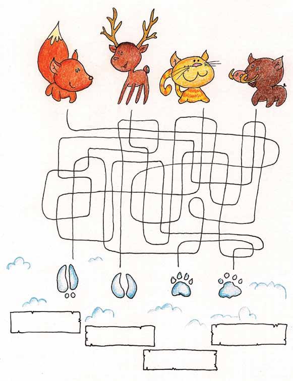 Meti Buh Gašparič V okence napiši ime živali, ki ji pripada sled v snegu. Nato s sledenjem črti preveri, če si se prav odločil.