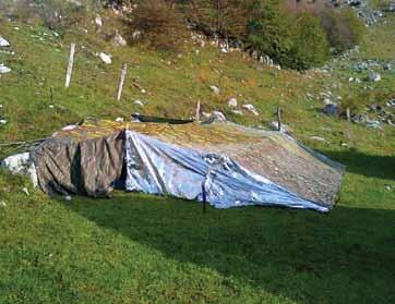 si na ognju pripravili večerjo, polento z golažem, in se ob toploti ognja zazibali v spanec, pod nebom iz šotorskih kril in stenami iz astro folije.