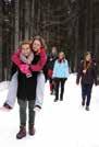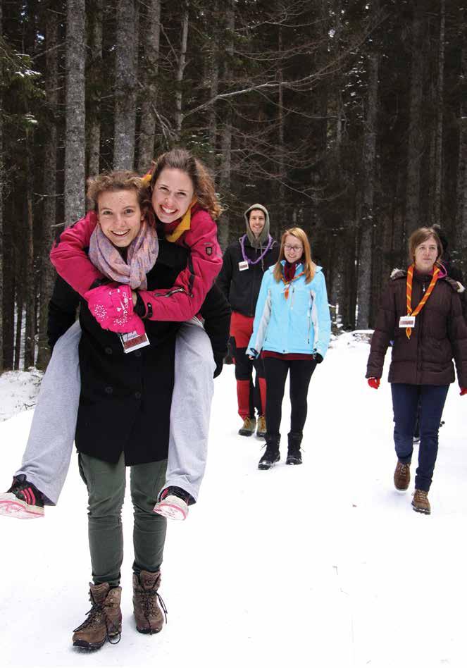 Kratek počitek po kosilu je nekaj tečajnikov prve pomoči izkoristilo za sprehod in zganjanje norčij na pravljično zasneženi Pokljuki. Tekli smo po snegu, se skrivali, iskali geocaching zakladke in iskali otroka v sebi. V ospredju sta tabornici Urša in Eva.