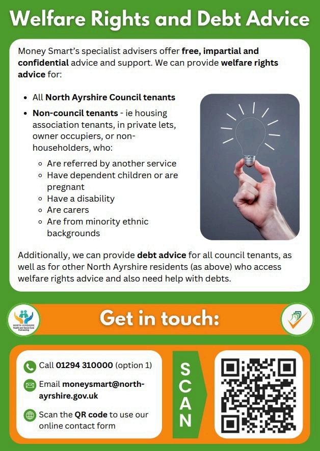 The Welfare Reform Advice Team directly delivers welfare rights and a debt advice service to Council tenants across North Ayrshire, with the aim of improving the income and living standards of individual tenants and communities as a whole.