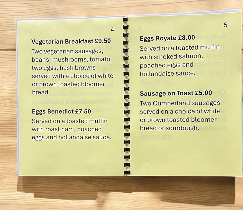 • Large print menu formatted for accessibility on yellow 80gsm paper.