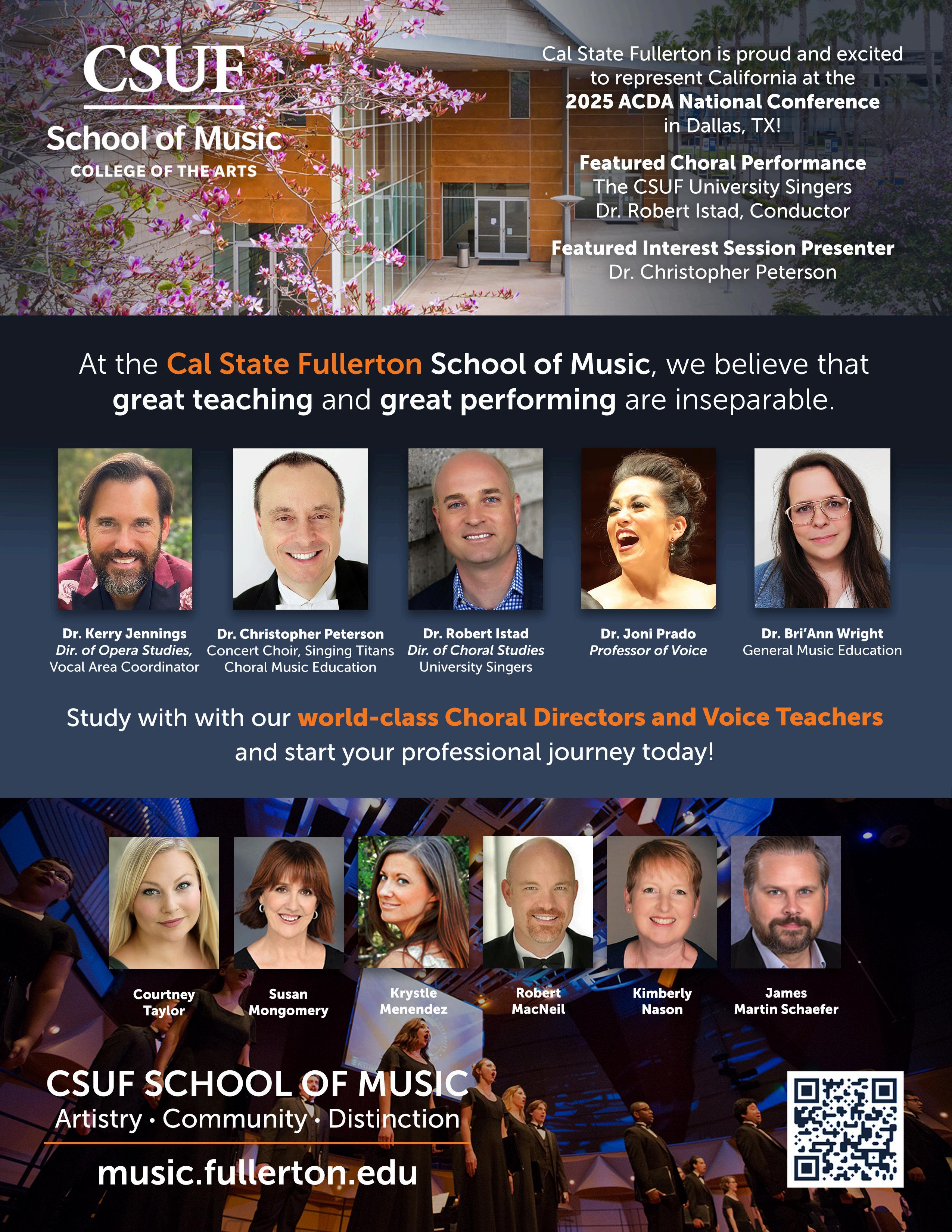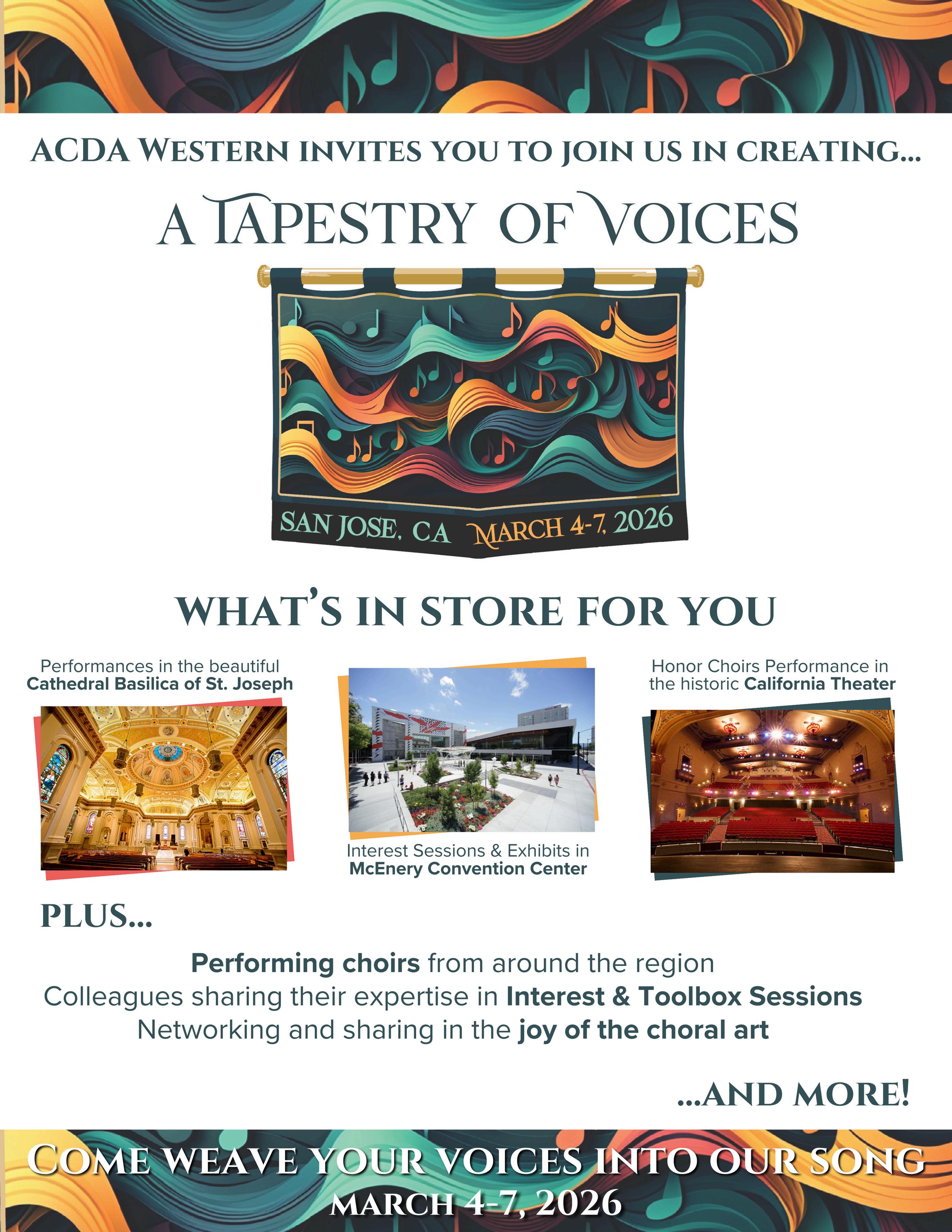 I look forward to the journey ahead as we lead choirs and audiences through transformative choral experiences. I encourage you to listen to the voices of our past, upon whose shoulders we now stand I encourage you to invite colleagues to experience the camaraderie and fellowship of ACDA I encourage you to accept that invitation from a new teacher in your area and attend their concert We can make a difference with small acknowledgments of our connections. Remember, we are YOUR board, we are here for you. I look forward to sharing plans for our 2026 Western Region Conference “A Tapestry of Voices” in San Jose, CA March 4-7 and look forward to seeing you in Dallas at the ACDA National Conference this spring
