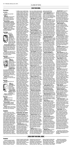 four years; debate national qualifier; Gonzaga University Dussault Scholarship-$50,000/four years; KPAX Student Service Award; Girls State, governor of majority party; National Honor Society; University of Arizona Academic Scholarship-$38,000/four years. Ellen Bonner: Kris and Robin Bonner, parents. Academic AllState; Air Force ROTC Scholarship, tuition, room and board, three years; All-State Soccer; Foundation for Community Health Healthcare Scholarship-$1,000; National Honor Society; Target Range Alumni Scholarship-$500; University of Portland President Scholarship-$20,000/four years. RayLee Bradburn: Shawn Marty, parent. Johnson & Wales Scholarship-$8,000/four years. Taylor Featherman: Jim and Shanna Featherman, parents. Elks Club Student of the Month Award; Montana Journalism Education Association (MJEA) Journalist of the Year Award; Montana Newspaper Association Scholarship-$1,000; National Federation of State High School Associations Student Broadcaster of the Year finalist; University of Butler Building Achievement Scholarship-$40,000/four years; University of Montana General Academic Scholarship-$6,000/ four years; University of Montana MJEA Journalist of the Year Scholarship-$10,000/four years. Anna Gragg: Scott and Toni Gragg, parents. All-State First Team, basketball and volleyball; All-State Second Team/Conference, volleyball; Academic AllState Award, basketball and volleyball; Caduceus Award; Eagle Scholar Award; Health Science Academy Ambassador; Liberty University Volleyball Scholarship-full ride; National Honor Society; University of Montana Volleyball Scholarship-full ride; Western Conference 2015 Volleyball Player of the Year. Robert Jenko: Dan and Lynn Jenko, parents. All-Conference track and field; Montana State University Governor’s Best and Brightest Scholarship-$8,000/ four years; Montana State University Model United Nations Scholarship-$1,000; Montana State University Premier Scholarship-$2,500; National Honor Society; Thespian Award. Morgan Johnson: Richard and Kim Johnson, parents. Softball All-Conference First Team and All-State First Team; Softball All-Conference Honorable Mention, two years; Academic All-State, basketball, softball and volleyball; National Honor Society; University of Montana Softball Athletic Scholarshipfour years; Basketball Varsity Letter Award; Softball Varsity Letter Award, four years; Volleyball Varsity Letter Award. Nathanael Jourdonnais: Scott and Mary Beth Jourdonnais, parents. Swimming All-State, two years; Academic All-State, two years; Elks Student of the Month; Eagle Scout; Linfield University Faculty Scholarship-$16,000/four years; Montana State University Premier Scholarship-$1,500; Oregon State University Provost Scholarship-$3,000/four years; Prudential Spirit of Community Award$1,000; Prudential Spirit of Community Top Montana High School Volunteer State Honoree; swimming team captain; United States Volunteer Service Award, president; University of Montana Academic Achievement Scholarship-$1,000/four years; Swimming Varsity Letter Award, four years; Tennis Varsity Letter Award Tennis, two years; VFW Eagle Scout of the Year-$500. Hannah Kearns: Mitch and Tobi Kearns, parents. Soccer All-Conference; track 4x100m relay state champion; Academic All-State Soccer, two years; Academic All-State Track and Field, two years; Carroll College Track Scholarship-$60,000/four years; Northern Arizona University Founders Blue Scholarship-$12,000/four years; Simplot Games, sixth place in 4x200m relay; University of Montana Track Scholarship-$14,000/ four years. Madison Keck: Dave and Tammy Keck, parents. Academic All-State; Case Western Reserve University Scholarship-$90,000/ four years; National Honor Society; University of Washington