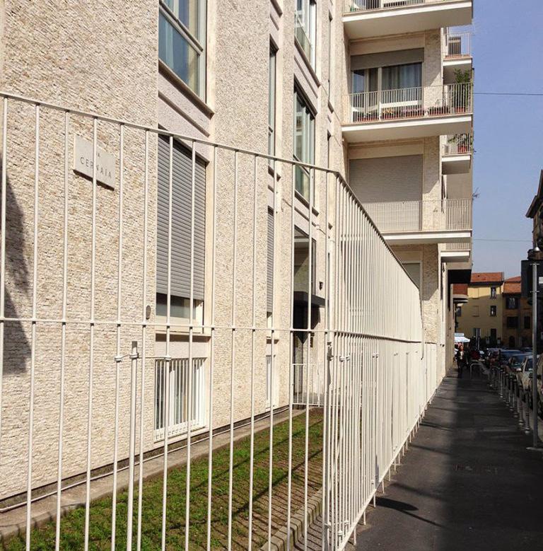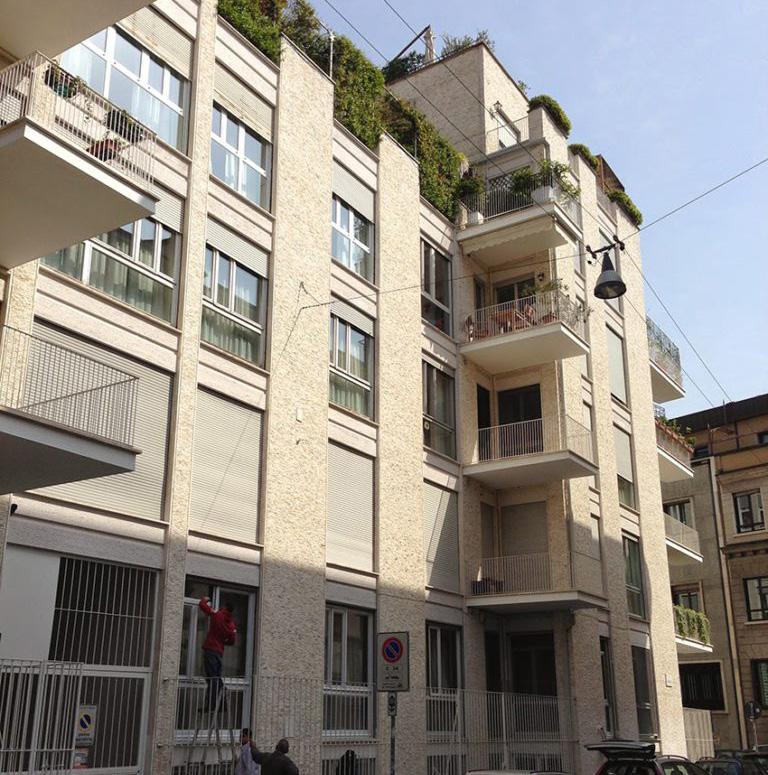 Das Condominio wurde 1948 von den Architekten Mario Asnago und Claudio Vender als Rekonstruktion eines durch den Krieg zerstörten Gebäudes entworfen. Das Gebäude zeichnet sich durch eine klare und funktionale Architektur aus, die typisch für die Nachkriegszeit ist. Die Fassade zur Piazza Sant‘Ambrogio hin ist mit Travertinplatten verkleidet, die so zugeschnitten sind, dass die Fugen mit den Fenstermaßen übereinstimmen. Dieses Detail sorgt für eine rhythmische und harmonische Fassadengestaltung. Die Fenster sind mit Eichenholzrahmen ausgestattet, was sowohl ästhetisch ansprechend als auch funktional ist. Eine horizontale Fascia marcapiano zwischen dem ersten und zweiten Stockwerk unterstreicht die horizontale Gliederung des Gebäudes. Der Haupteingang wird durch ein leicht eingezogenes, bogenförmiges Portal hervorgehoben, das aus dem gleichen Travertinmaterial wie die Fassade besteht. Zusätzlich gibt es eine Garage, deren Zufahrt durch ein schlichtes, in einem dezenten Farbton gehaltenes Tor verborgen ist, das sich nahtlos in die Fassadengestaltung einfügt.