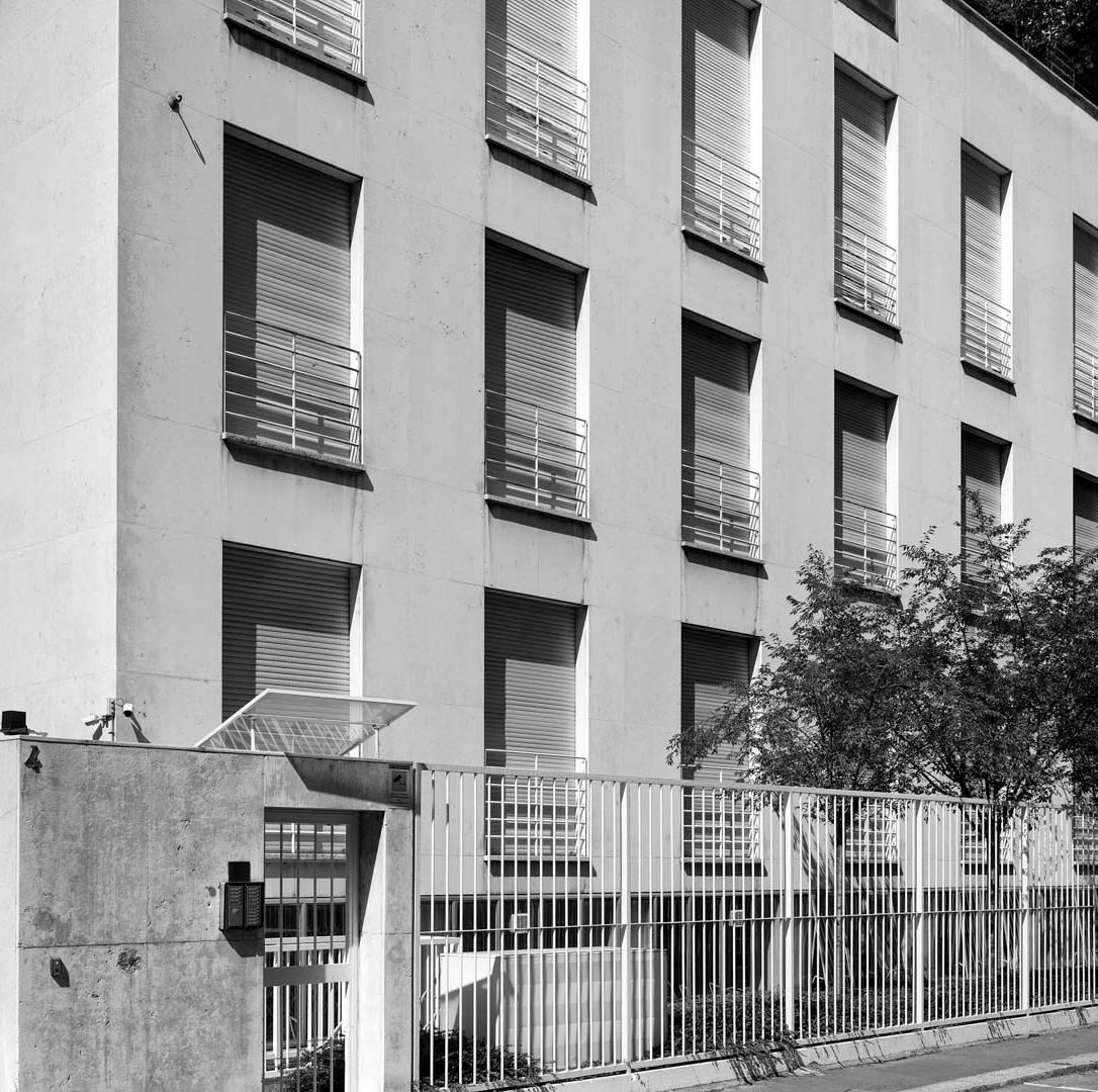 Das Gebäude in der Via Lanzone 4 kombiniert Büro- und Wohnräume und zeichnet sich durch seine moderne Architektur aus. Die Fassade des unteren Trakts besteht aus weißen Perlino-Marmorplatten, während die oberen Wohnbereiche durch große Fensterbänder geprägt sind.