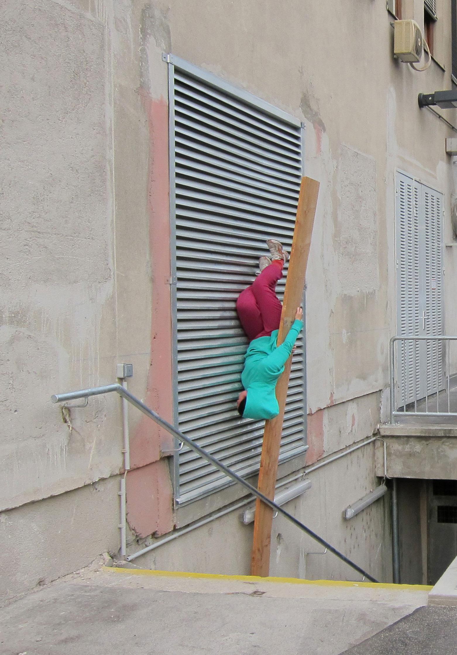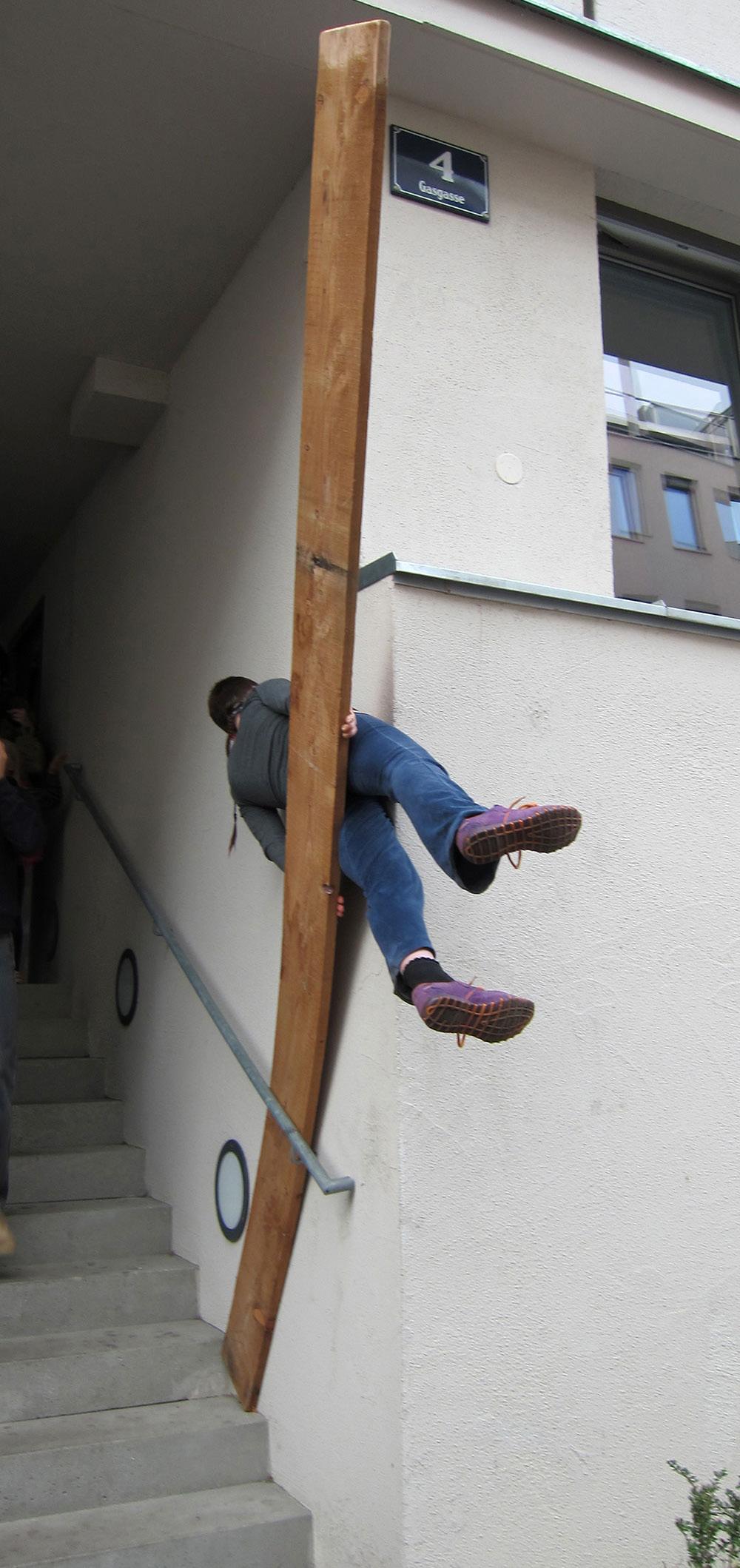Das Projekt ‚Fitting‘ von Prof. Dr.in Gabu Heindl und Willi Dorner ist aus Anlass der immer zunehmenden Einschränkung der Nutzung des öffentlichen Raumes entstanden. Die unmenschlichen städtischen Strukturen werden als Landschaft und als bebaubare Formationen verstanden. Die performative Intervention setzt genau dort an. Dabei verwenden sie als Grundelement ein Holzbrett, ein Teil eines Hauses, das zum Bauen von Abtrennungen genutzt wird.19 Durch das Platzieren des Bretts zwischen Geländer und Wand im halböffentlichen und öffentlichen Bereich entsteht ein neuer Raum. Genau in diesen Zwischenraum klemmen sich die Performer*innen . Betrachtet man das Projekt aus der Perspektive der ‚dirty theory‘ beschreibt der Umgang mit Raum die eines ‚dirty theorist‘. Weiche Körper pressen sich gegen harte, dreckige Fassaden. Sogar das Gesicht als intimstes Körperteil ist ungeschützt gegen den rauen Putz gerichtet. Menschliche Körper stehen, sitzen oder laufen normalerweise die Position des starr auskragenden Körpers und die des überkopf gekrümmten erscheint jedoch deplatziert im Raum. Mit ihrer Intervention überschreiten sie Grenzen, platzieren ihre eigene Materie neu und nehmen eine bisher unbekannte Perspektive ein. Ohne Hemmung kleben sie wie Dreck an der Fassade, stören die uns bekannte Ordnung und hinterfragt damit ihre Funktion. Der Mensch ist sich seiner eigenen Architektur zu wider.
