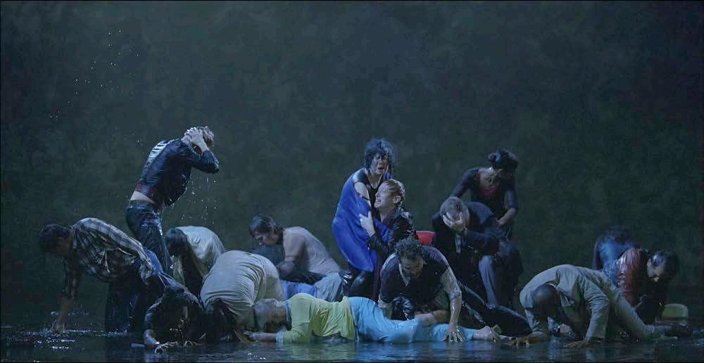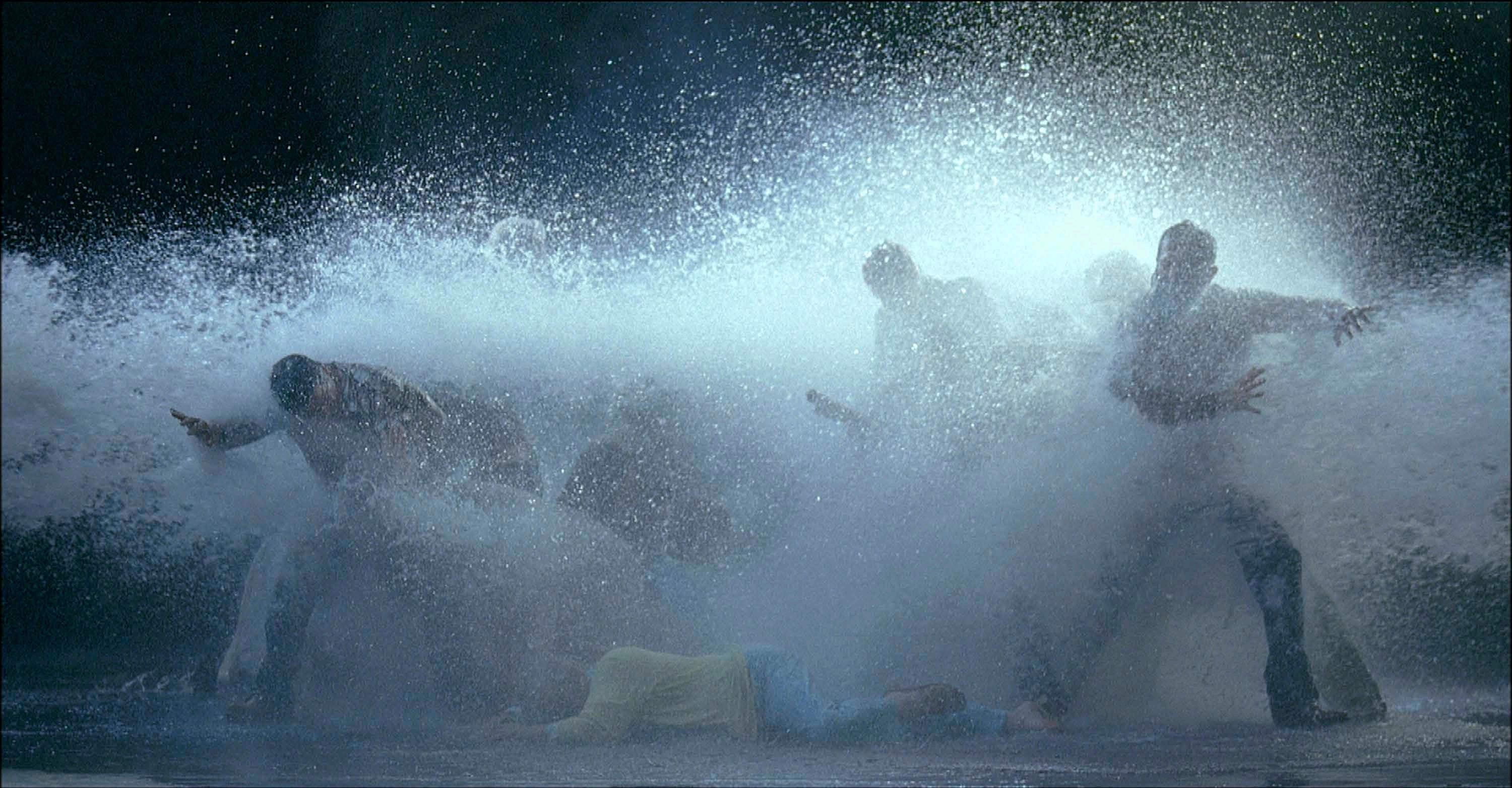 The Raft depicts a life-sized scale of a group of nineteen men and women from a variety of ethnic and economic backgrounds, casually standing together. Suddenly, they are struck by strong blasts of water that rush in from out of frame. Some are immediately knocked over, and others brace themselves against the unprovoked deluge. People in the group cling to each other for survival, as the simple act of remaining upright becomes an intense physical struggle. Then, as suddenly as it arrived, the water stops, leaving behind a band of suffering, bewildered, and battered individuals. The group slowly recovers as some regain their senses, others weep, while the few with any strength assist those who have fallen. The viewer experiences this event in an immersive setting, standing in a darkened room surrounded by the roaring sounds of the water. Captured in slow-motion, The Raft arouses a visceral experience of calamity and shared humanity, provoking a consideration of the range of responses to crisis and the resilience found in community.