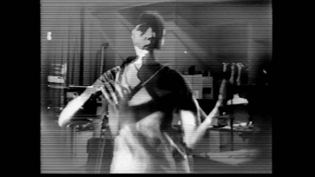 Steina, Violin Power, 1970-78. Single-channel digital video (black and white, sound), projector, 10 minutes 4 seconds. Image courtesy of the artist.