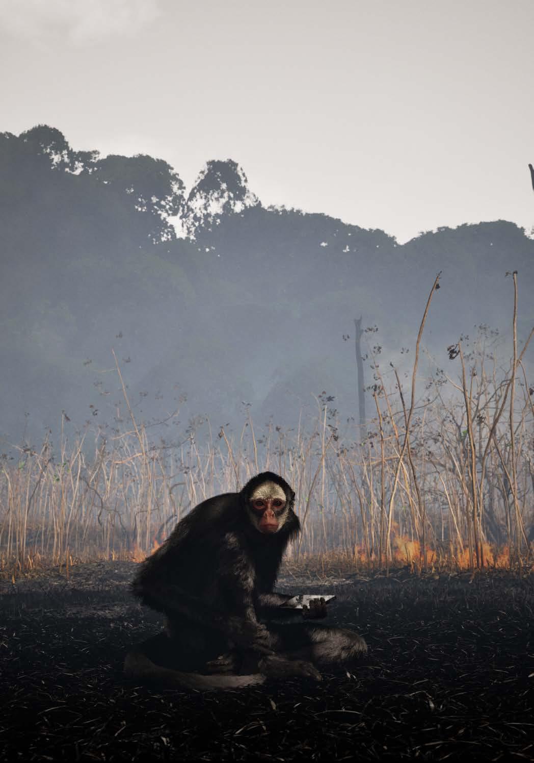 In Ghost Feed, a white-cheeked spider monkey sits nearly motionless in a virtual forest, immobilized by a smartphone screen that loops an endless feed of its own reflection. As digital day fades into night in this game-engine-driven simulation, flames—drawn from real footage of wildfires ravaging the Amazon and California— slowly consume the surrounding landscape. Meanwhile, John Gerrard presents the monkey as remaining transfixed by the phone, unaware or even indifferent to the unfolding scene around it. In so doing, Gerrard captures the paralyzing impression of a global sense of inertia amid unraveling ecosystems and eroding geopolitical agency.
