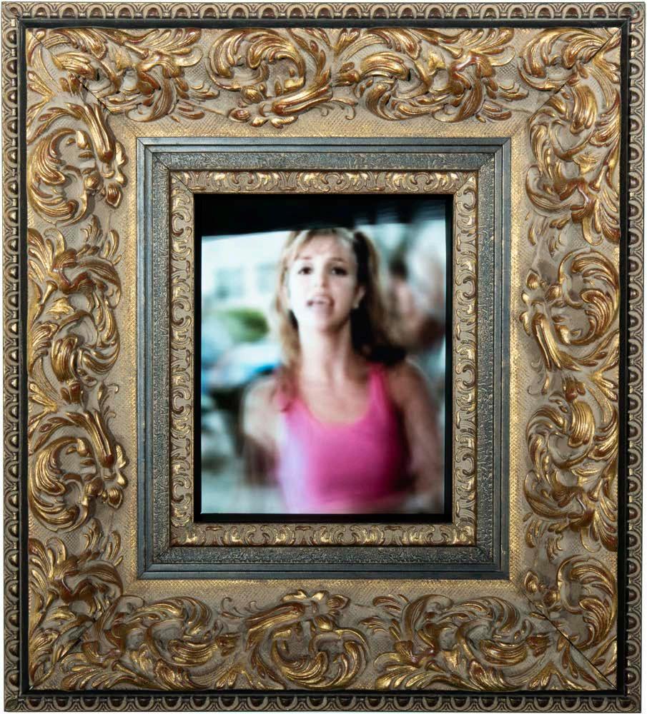 R. Luke DuBois, (Pop) Icon: Britney, 2010. Single-channel HD video (color, sound), custom wood frame, stereo speakers, 60 minutes. Photo by Jamie Stukenberg, © R. Luke DuBois. Courtesy of the artist and the Carl and Marilynn Thoma Foundation.